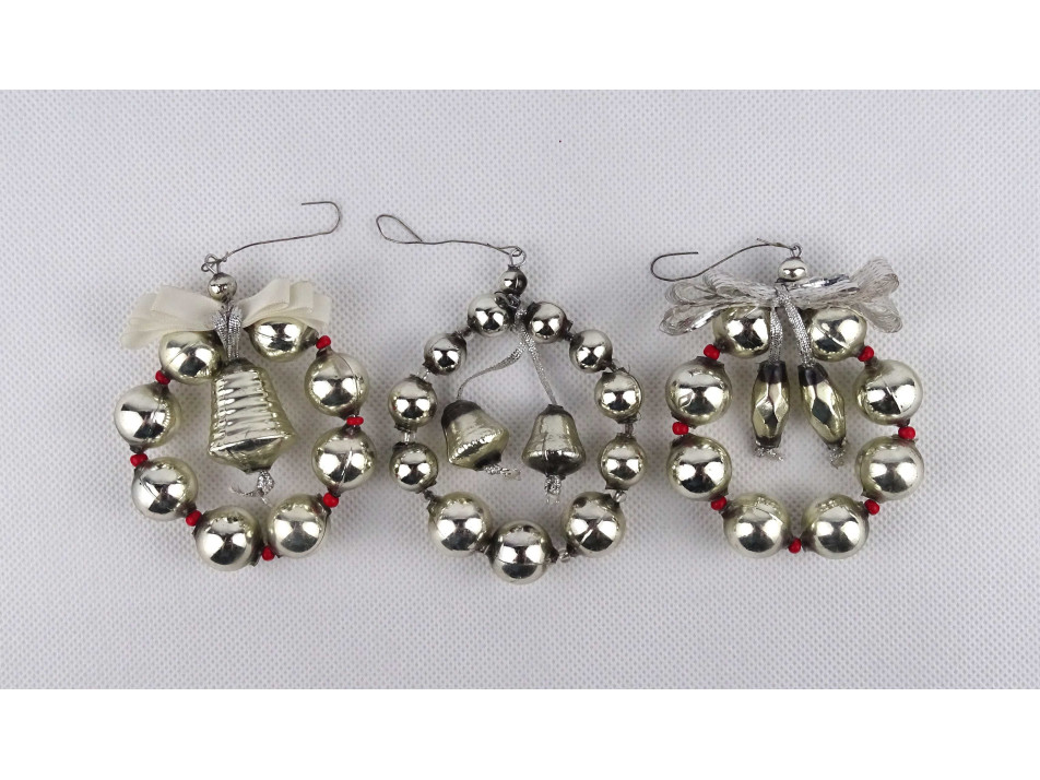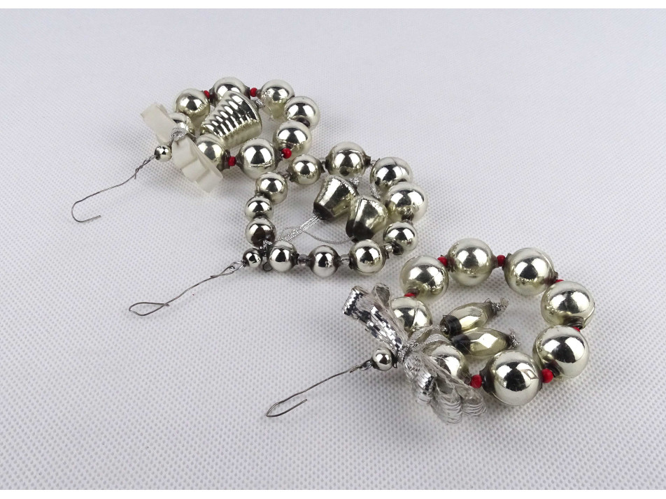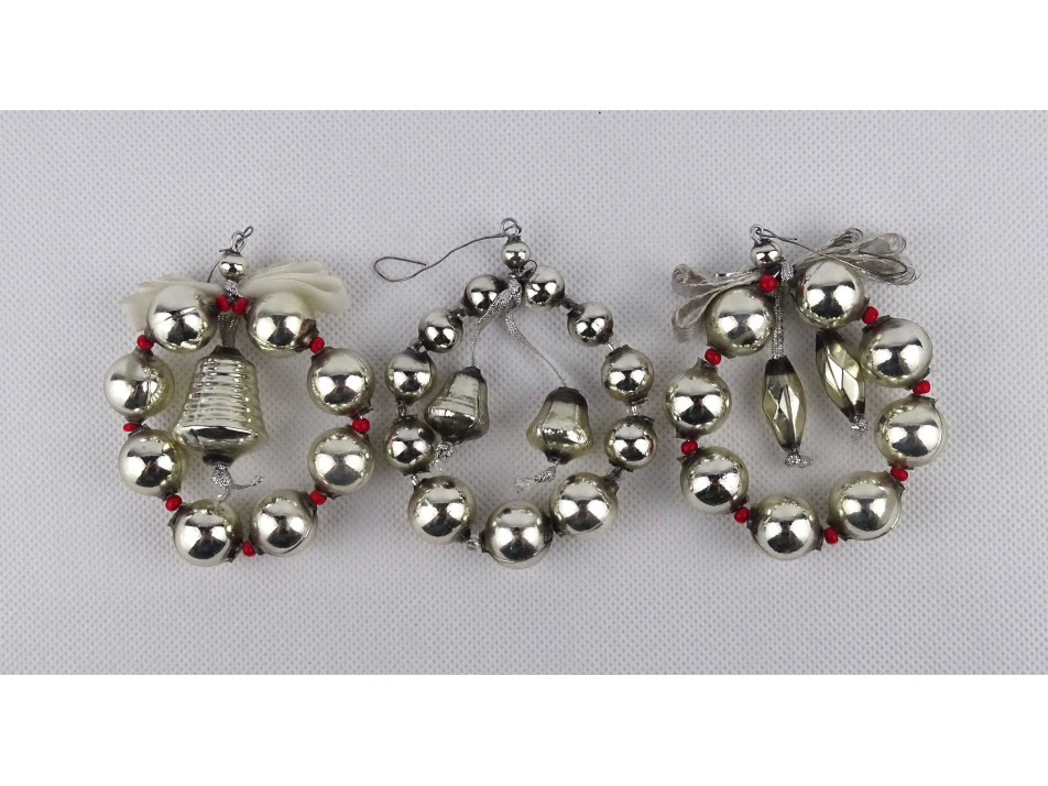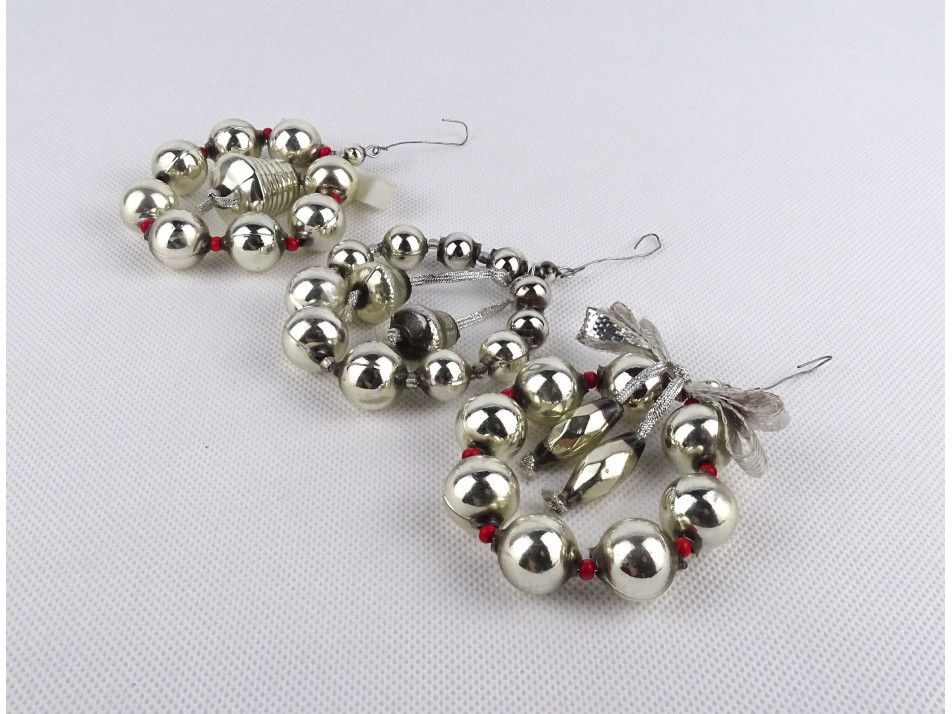 Régi, hibátlan állapotú, ezüst színű kis üveg gömbökből álló koszorú, karácsonyfadísz csomag, 3 darab egyben.