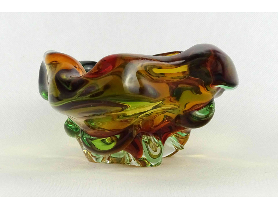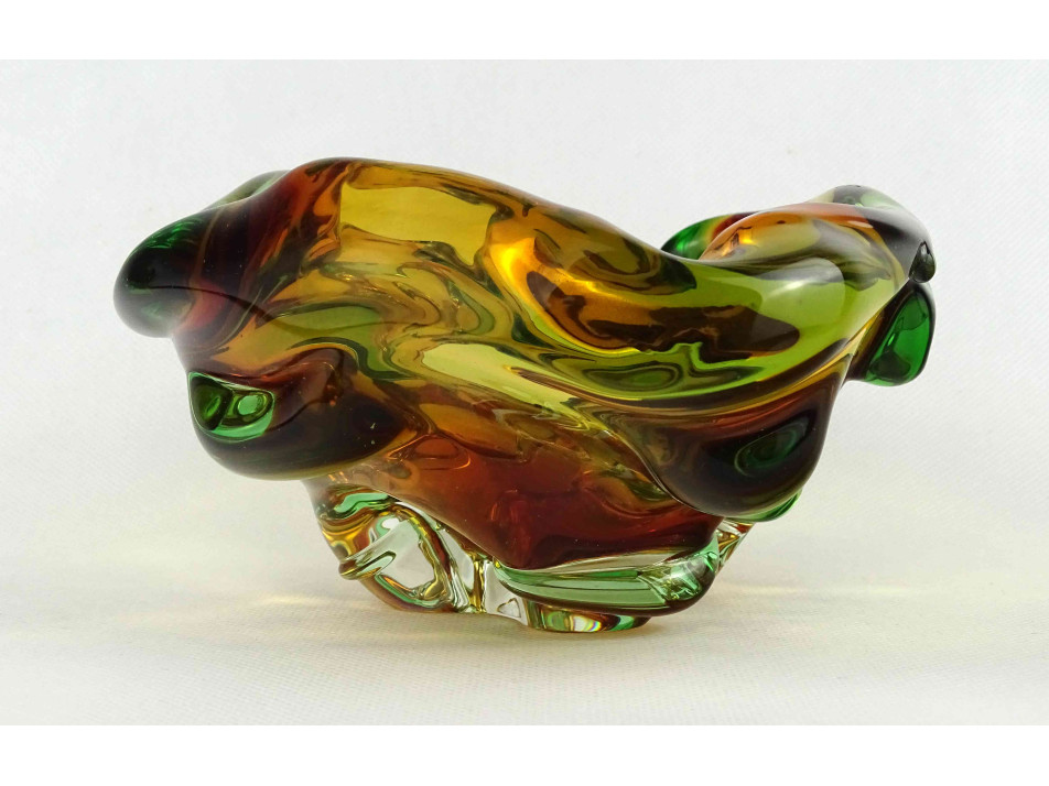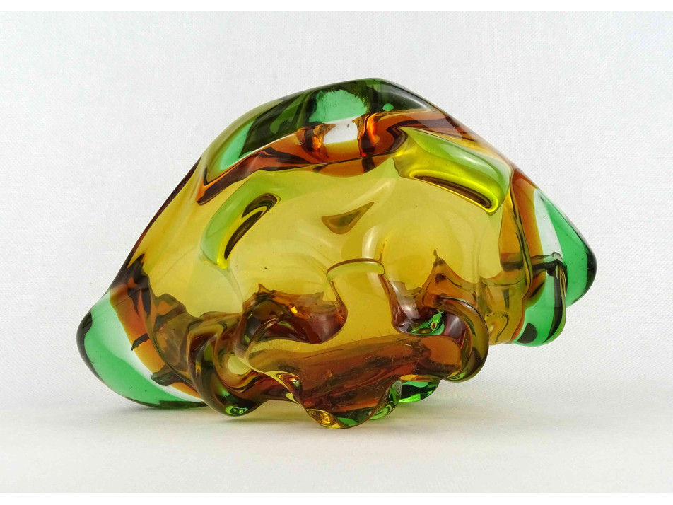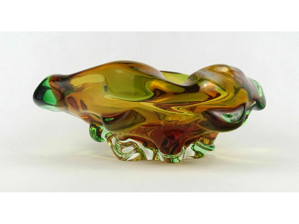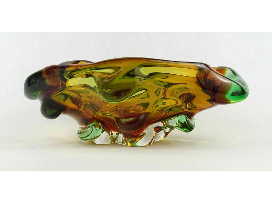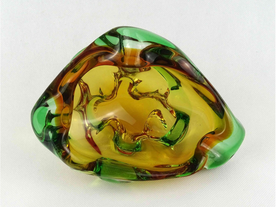 Nagyméretű zöld és borostyán színű cseh sommerso BOHEMIA művészi üveg hamutál 23 cm