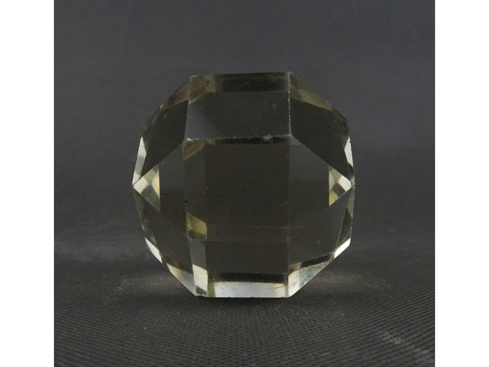 Régi, ép állapotú, 26 síklappal határolt üveg íróasztali kellék, üveg levélnehezék. Élei és sarkai kopottak, karcosak.
