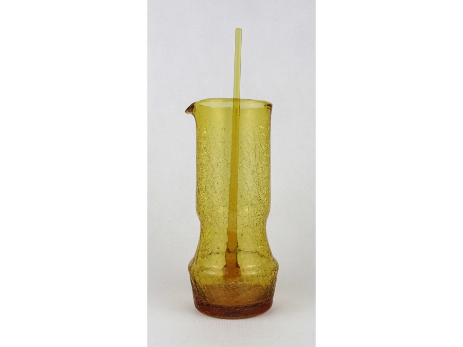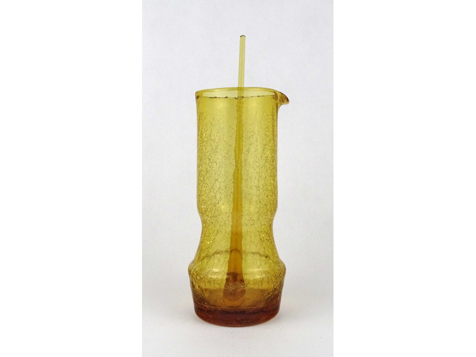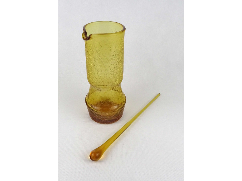 Borostyánsárga színű, modern formavilágú, repesztett, erezett mintázatú design karcagi üveg kiöntő, kancsó, hozzá tartozó üveg keverő pálcával.