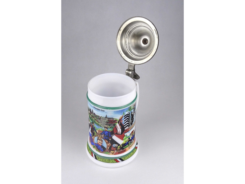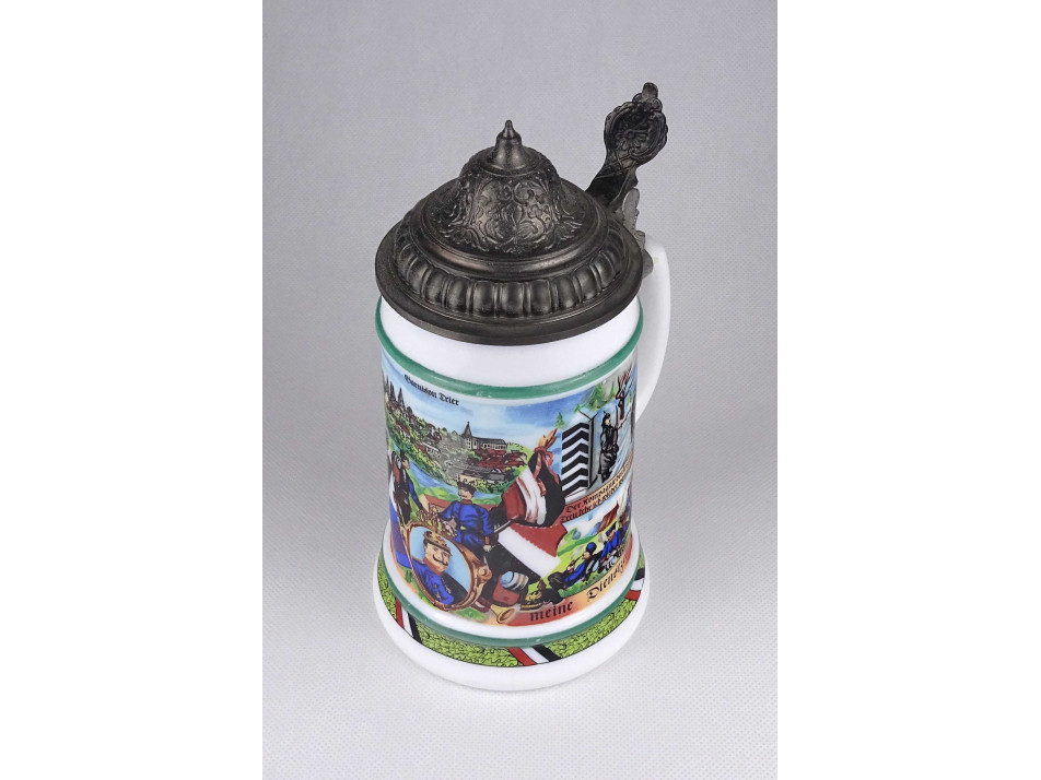 Régi, ónfedeles német fehér üveg söröskorsó, sörös kupa. Oldala első világháborús katonai életképekkel és német katonai jelképekkel díszített.