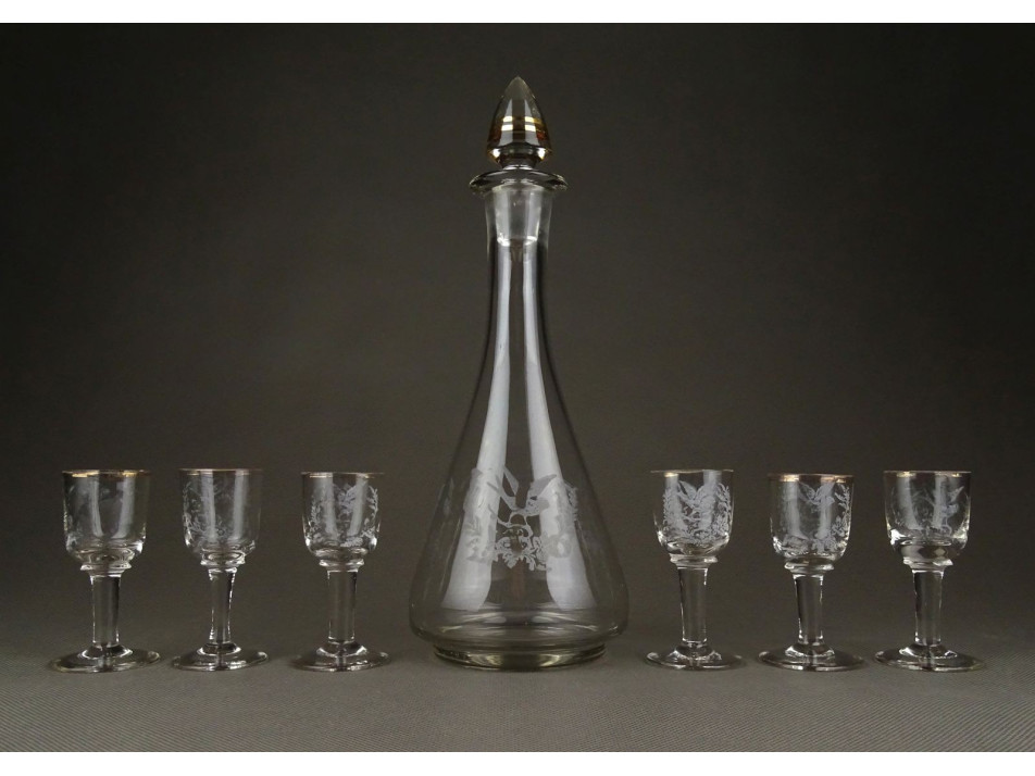 Régi hat darabos madár díszes üveg pálinkás kínáló készlet