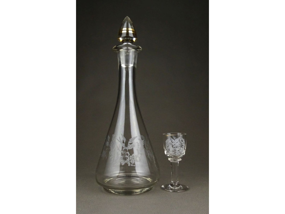 Régi szép állapotú, üveg pálinkás készlet. A kínáló és a poharak is galamb, madár díszítésesek. A kínáló dugója is meg van.