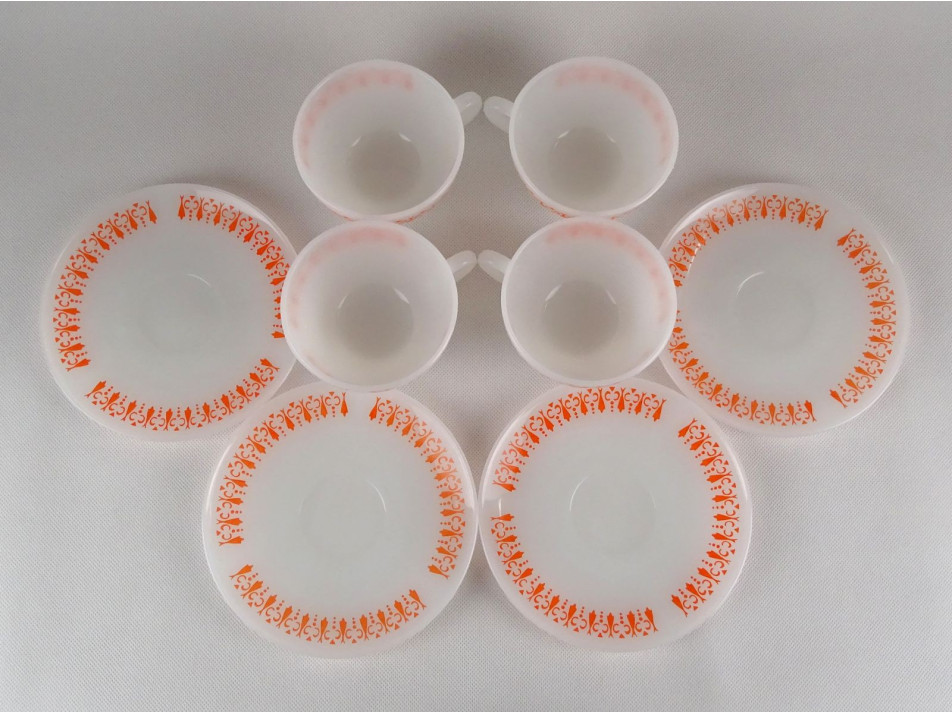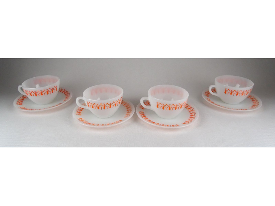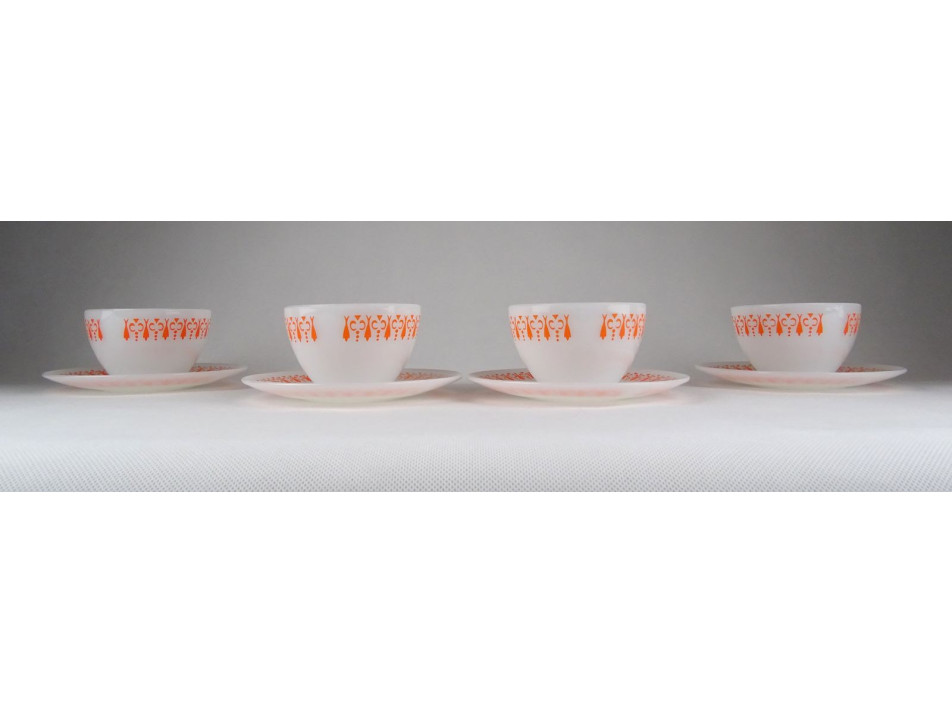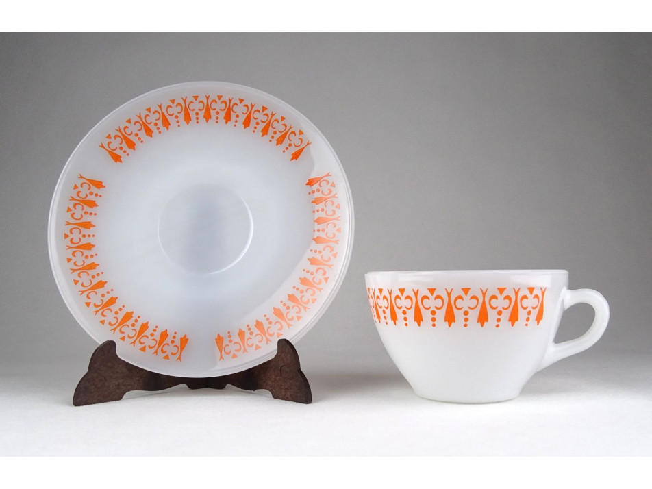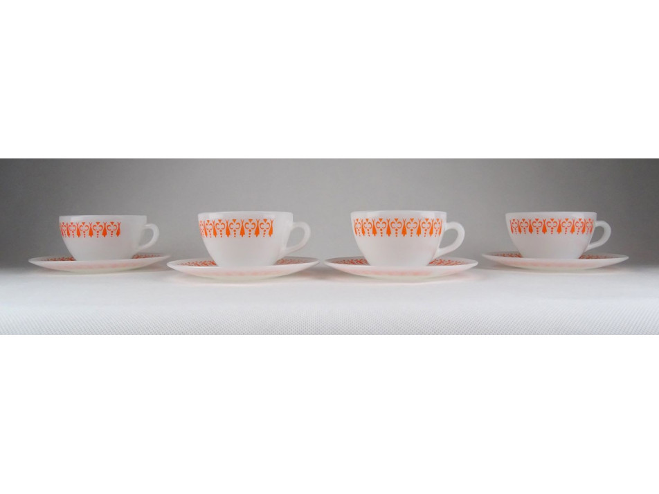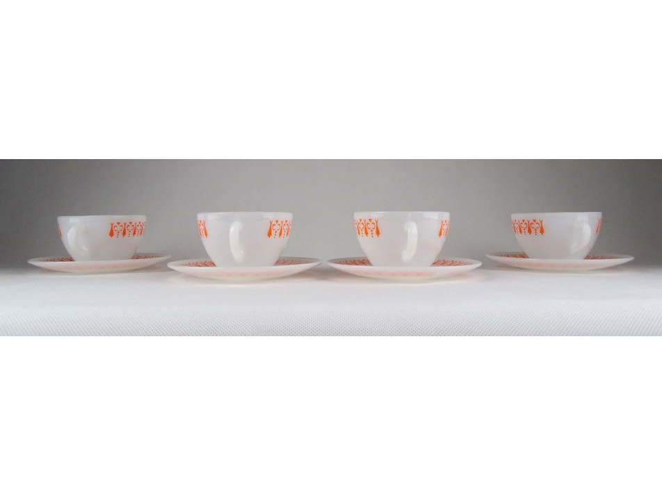 Hibátlan állapotú, tejfehér üveg teáskészlet, narancssárga retro díszítéssel.