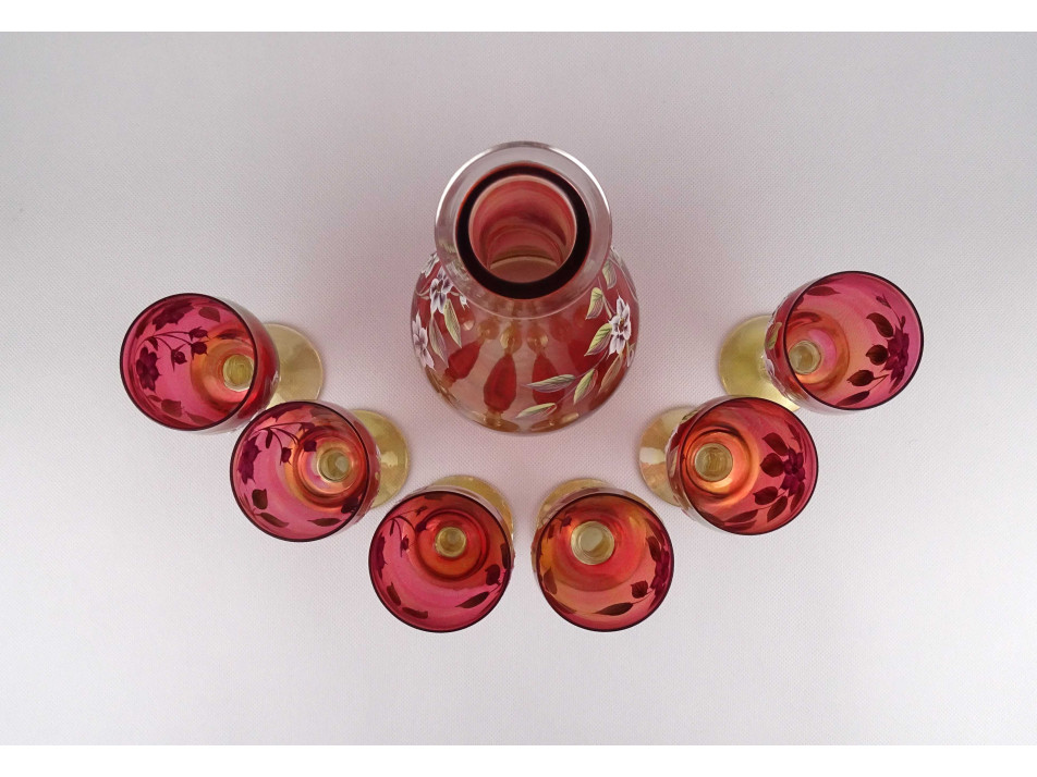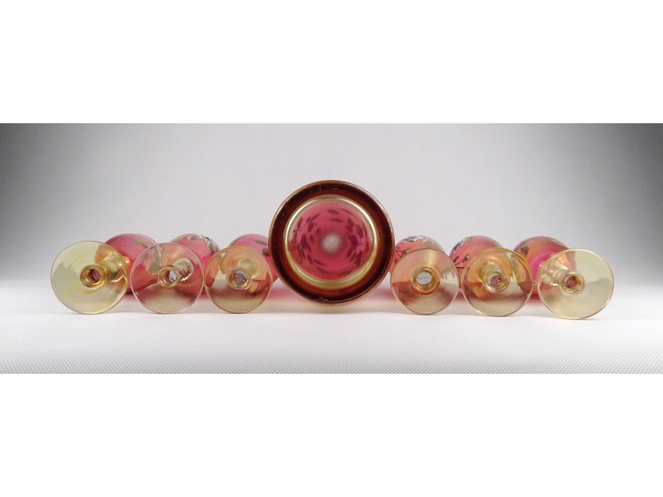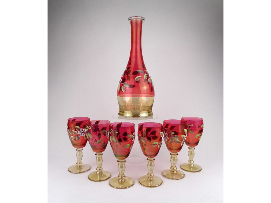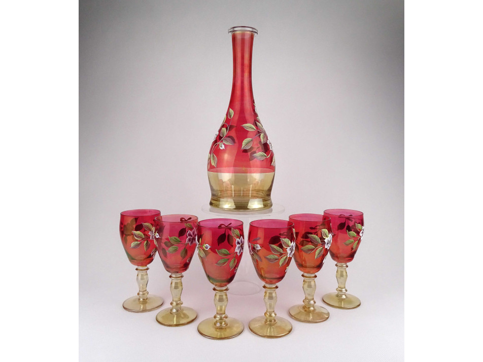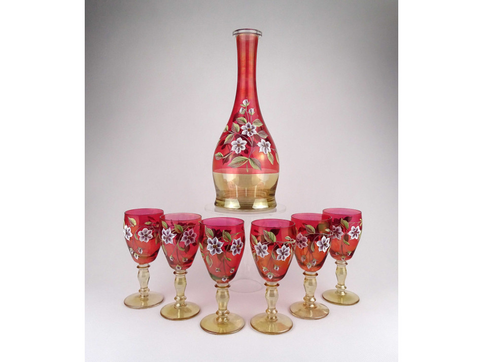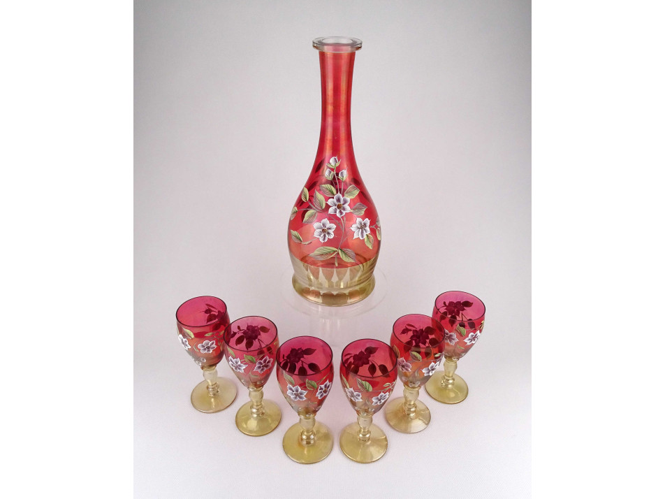 Régi, kézzel festett, plasztikus virág mintával díszített, színezett Bohémia üveg kínáló üvegpalack és talpas boros pohár készlet. A készlet darabjai: - 1 darab kínáló palack 31.2 x 12.5 cm - 6 darab talpas borospohár 15.2 x 6.7 cm