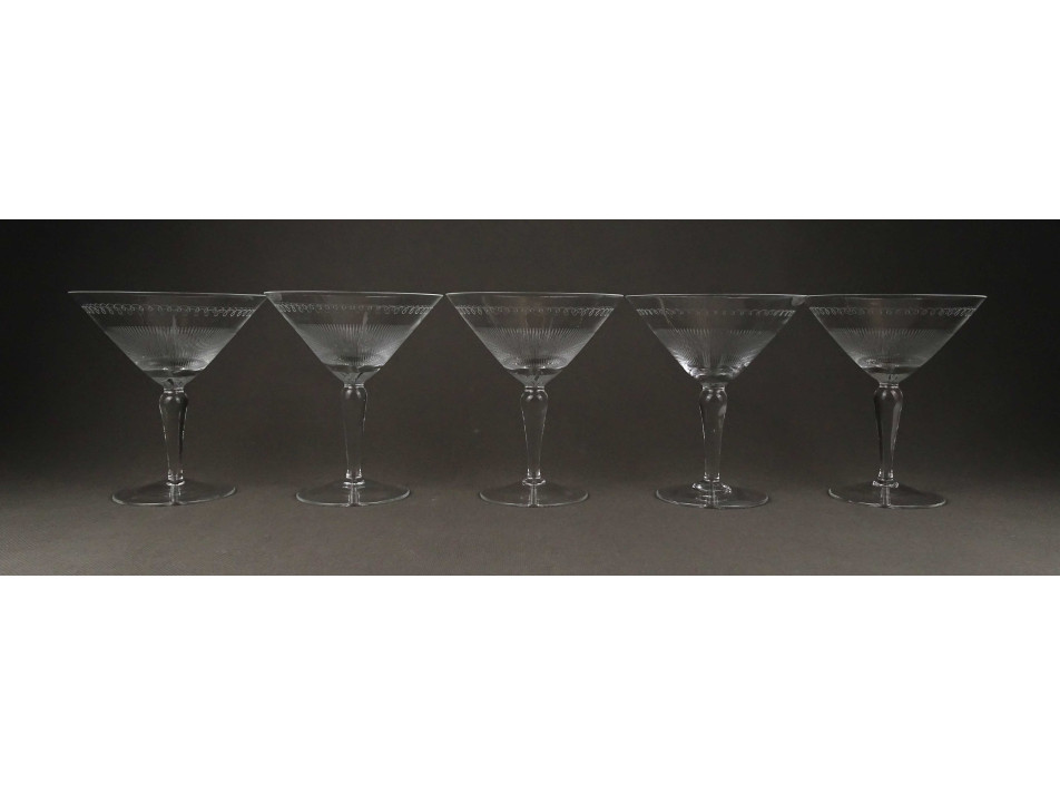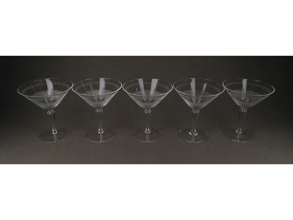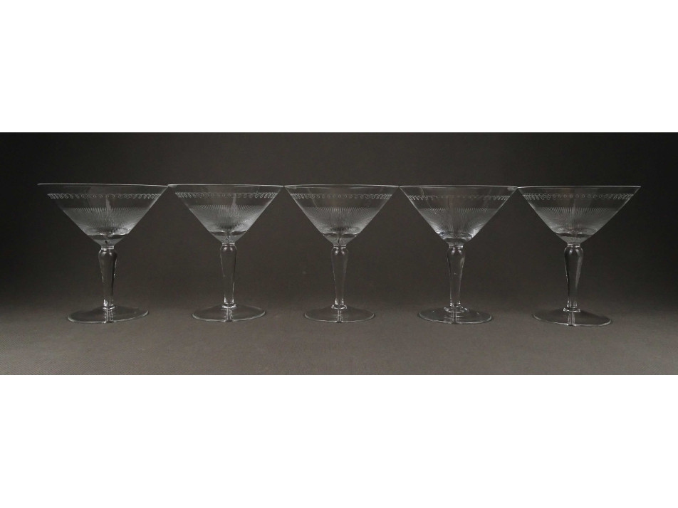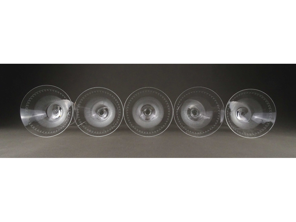 Régi, hibátlan állapotú, elegáns, talpas üveg pezsgőspohár készlet. Oldalán körben spirális mintákkal díszítve. 5 darab.