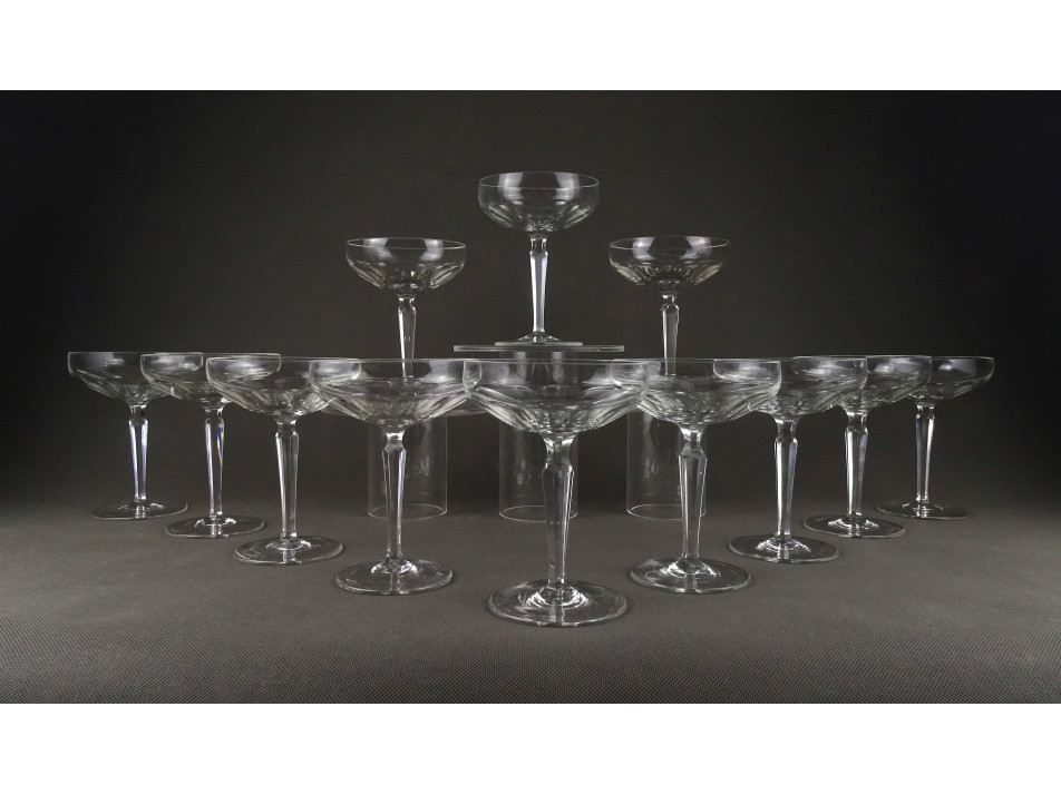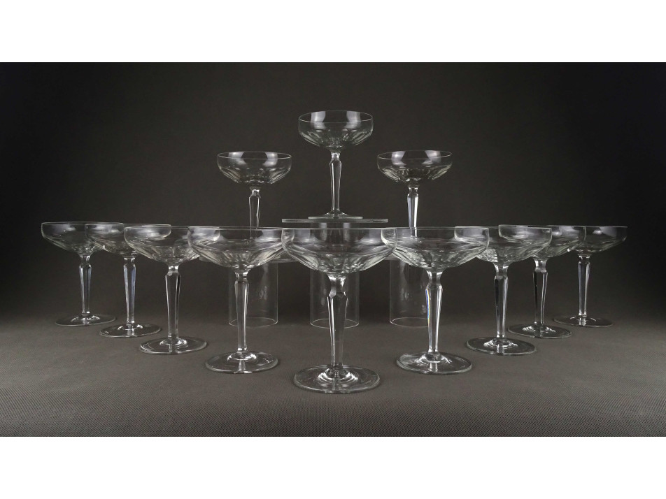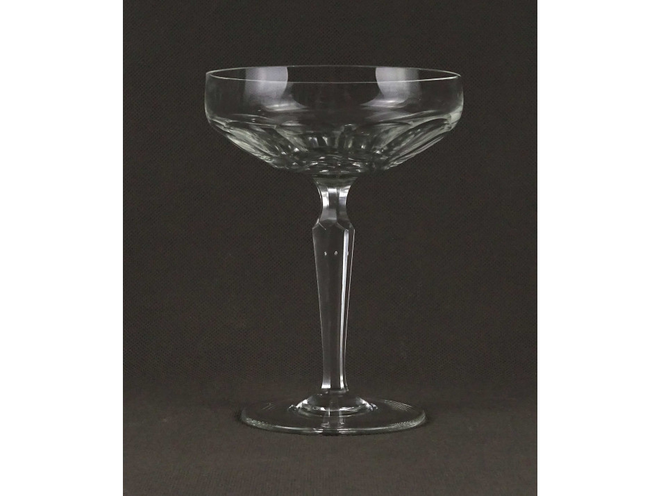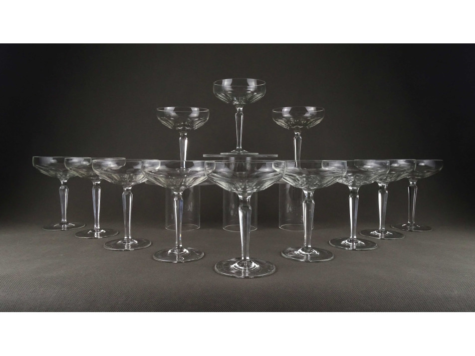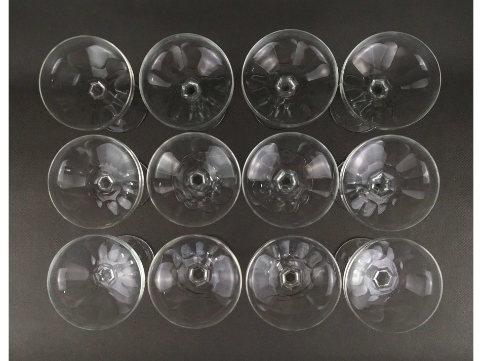 Régi, elegáns fazettásra csiszolt, talpas pezsgős üveg pohár készlet, 12 darab