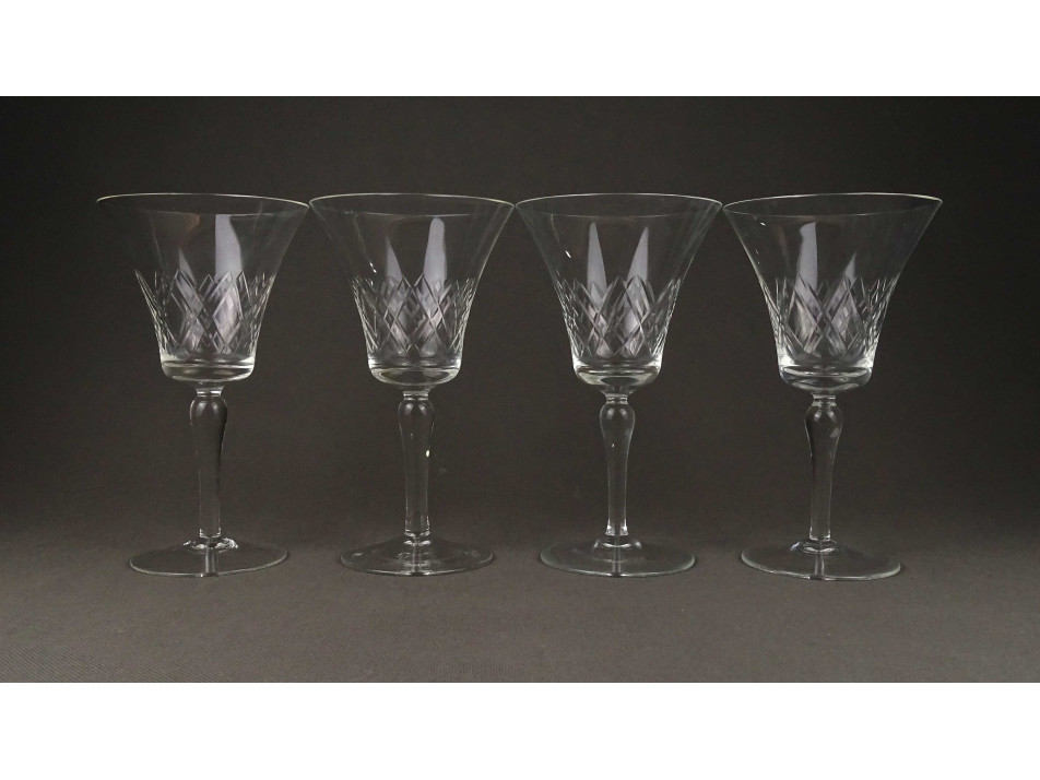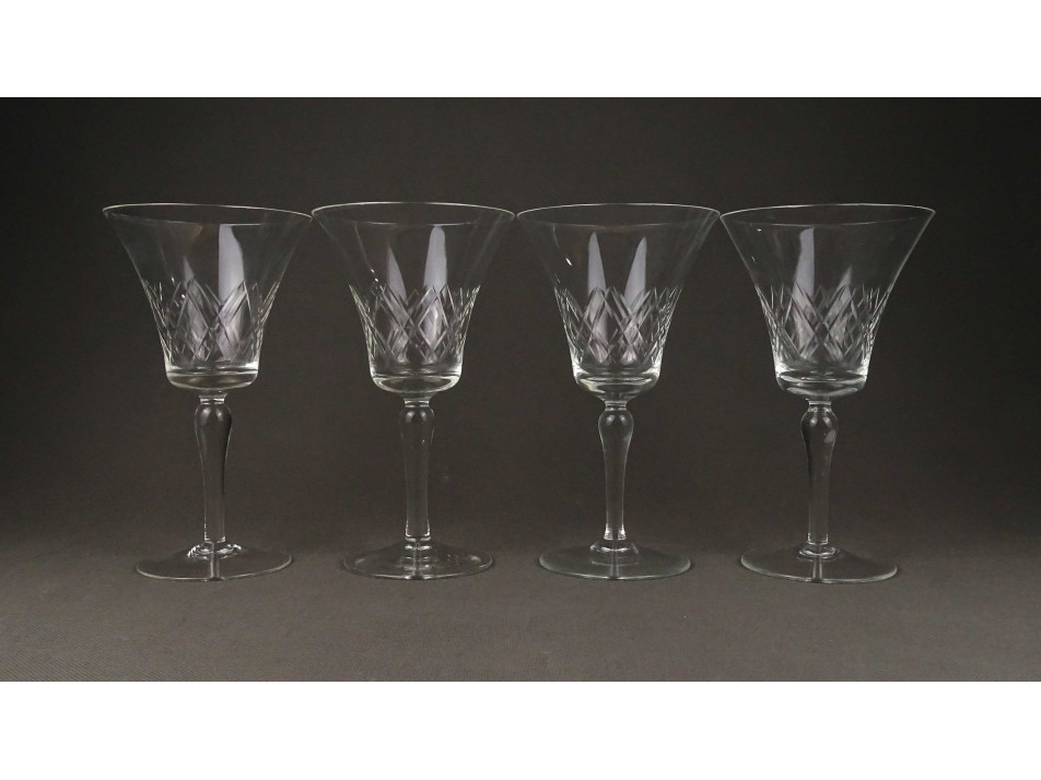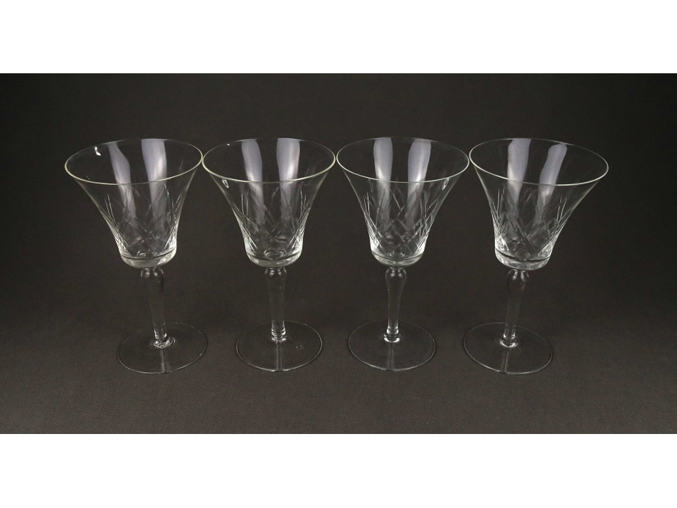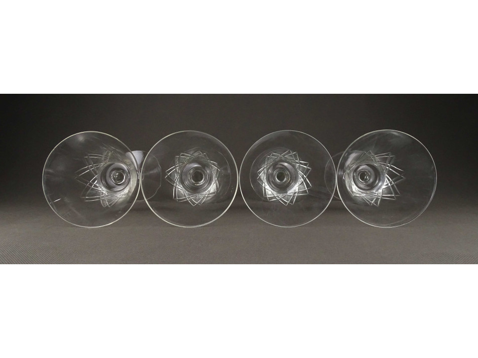Gyönyörű, elegáns, hibátlan állapotú, négy darabos talpas pohár készlet. A poharak oldala csiszolt motívumokkal díszített.