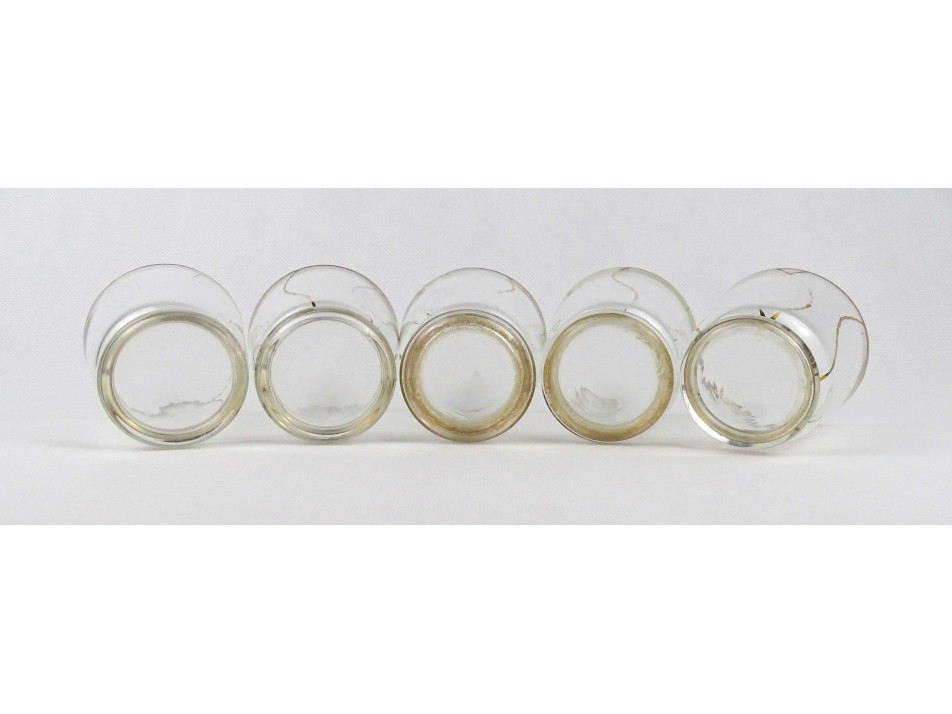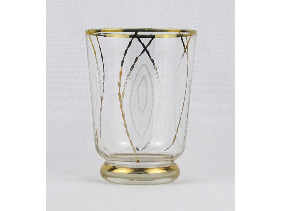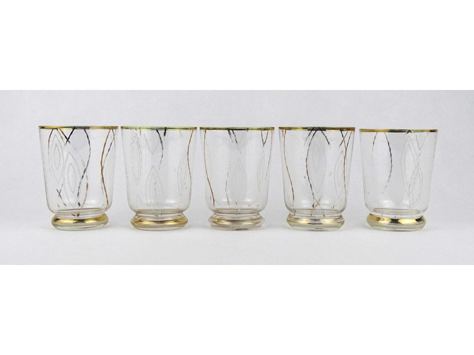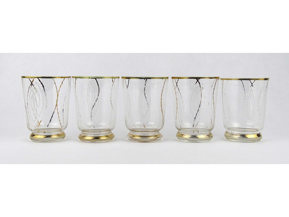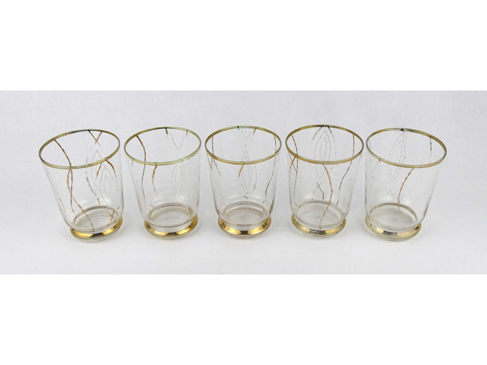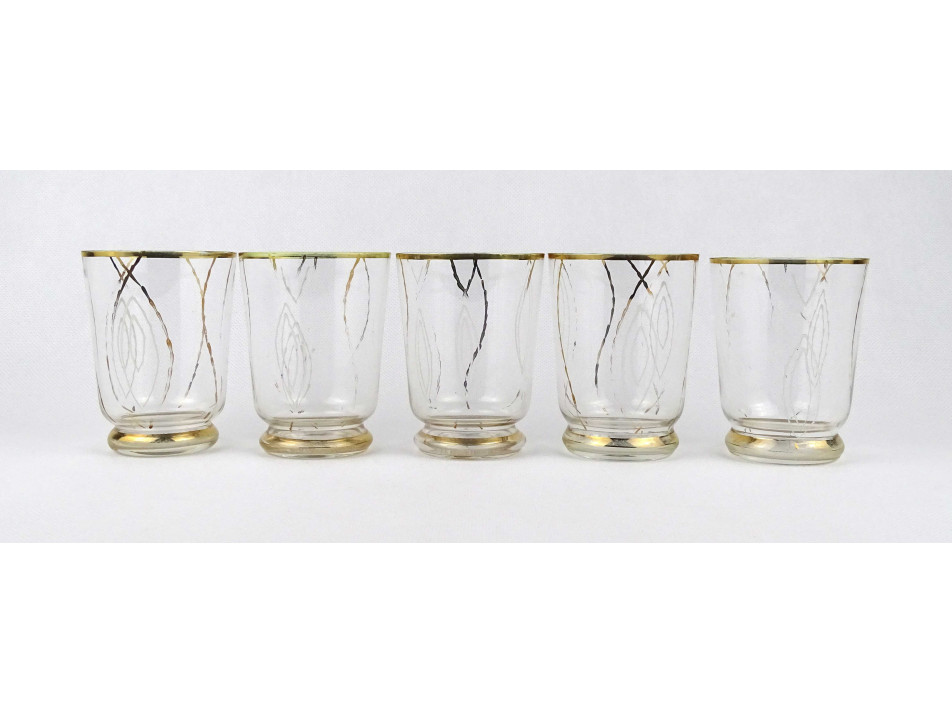 Régi, vékonyfalú, aranyozott fújt üveg pohár készlet, 5 darab. Oldalán kézzel festett, aranyozott díszítés látható.