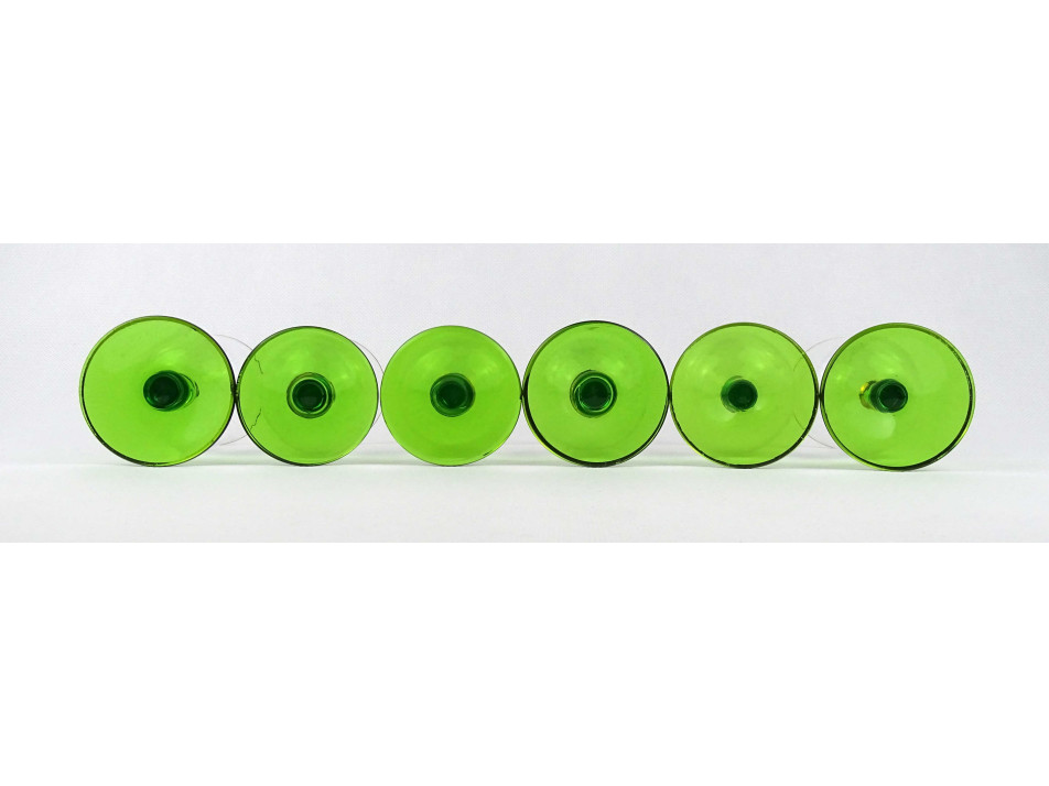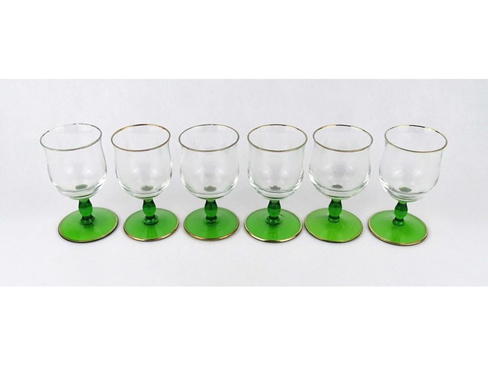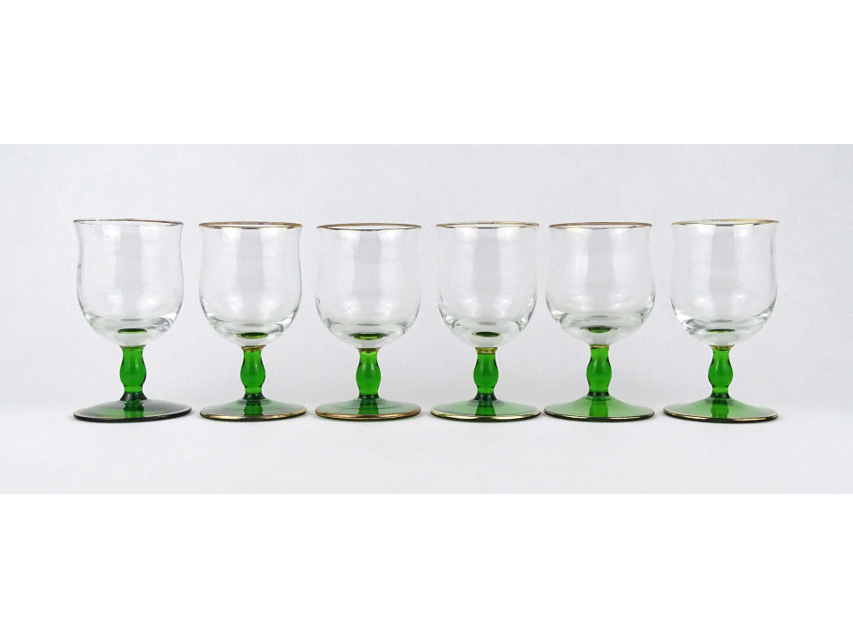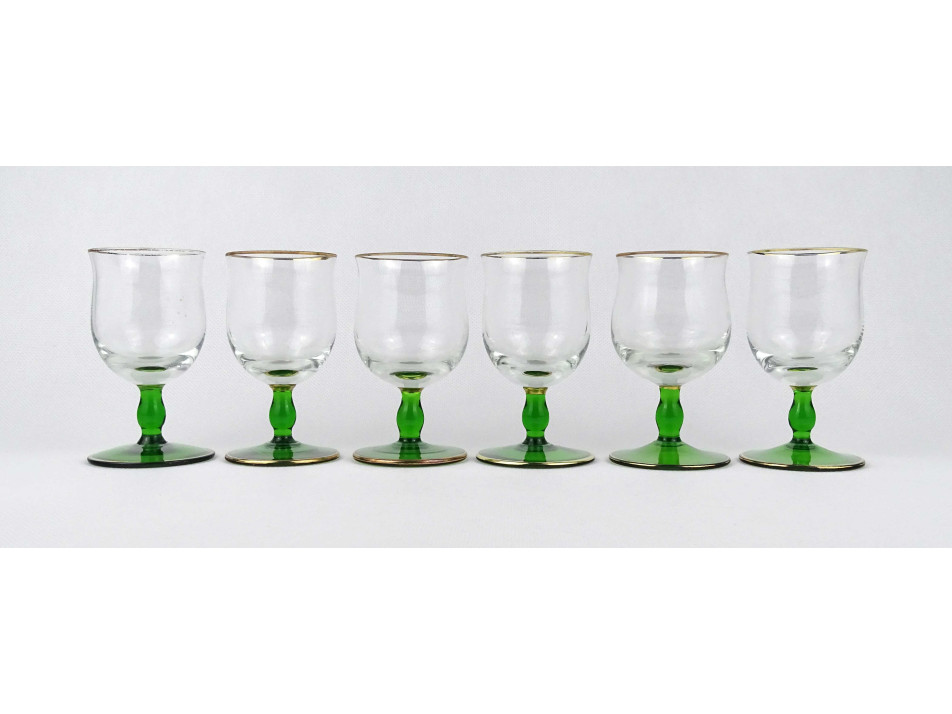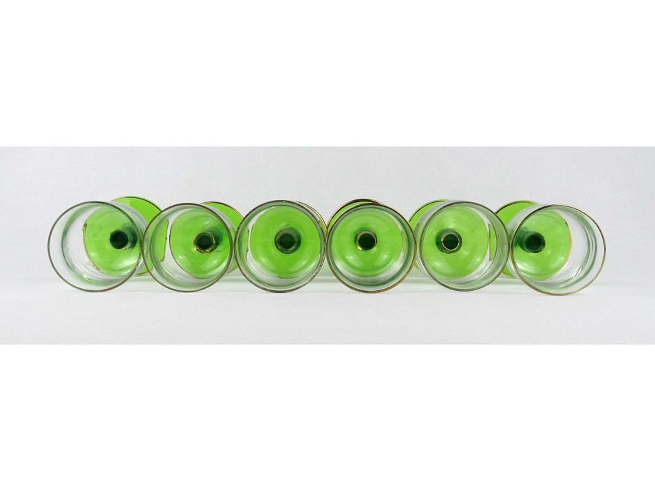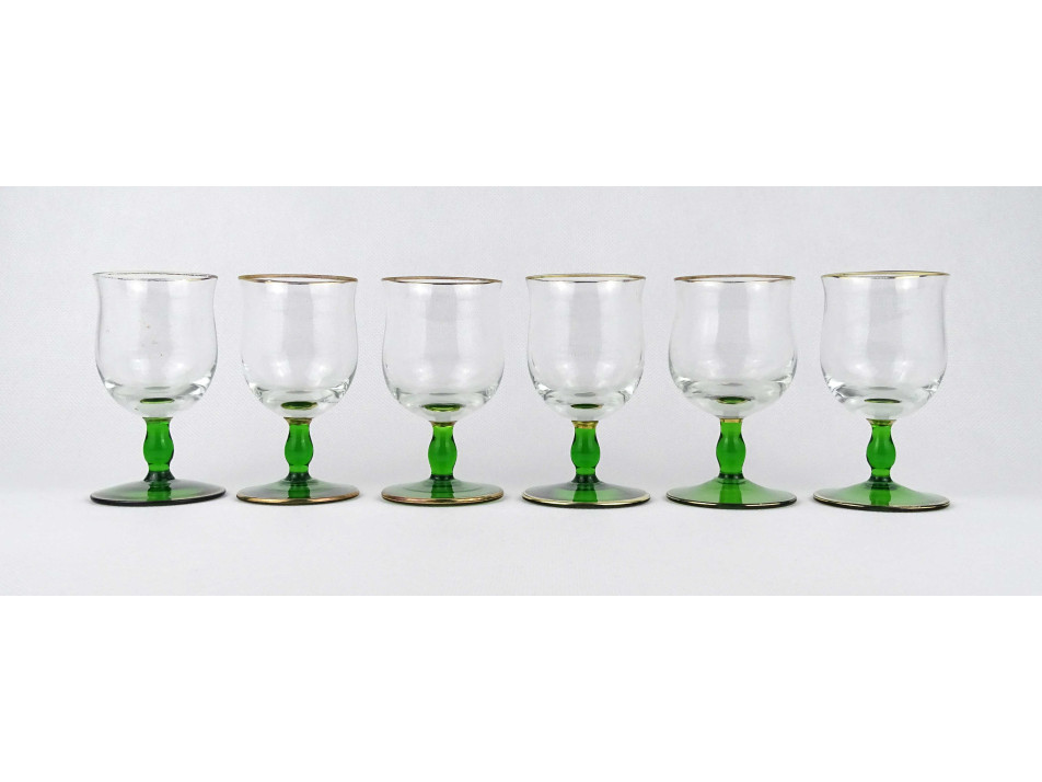 Régi, hat személyes, zöld talpas, likőrös üveg pohár készlet. A poharak finoman aranyozottak.