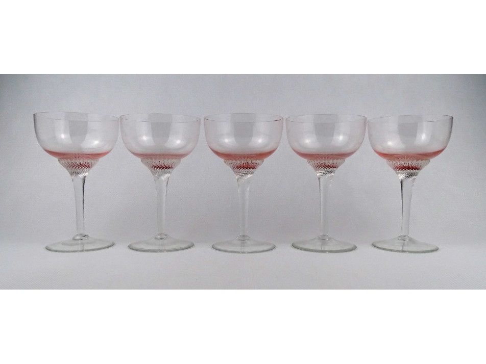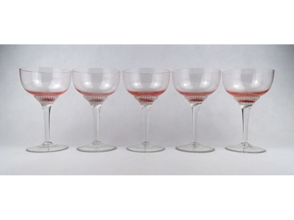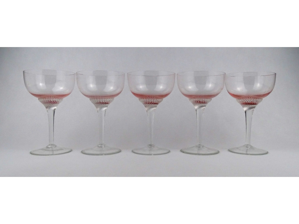 Hibátlan állapotú, öt darabos, elegáns rózsaszín, talpas pezsgős üveg pohár készlet.