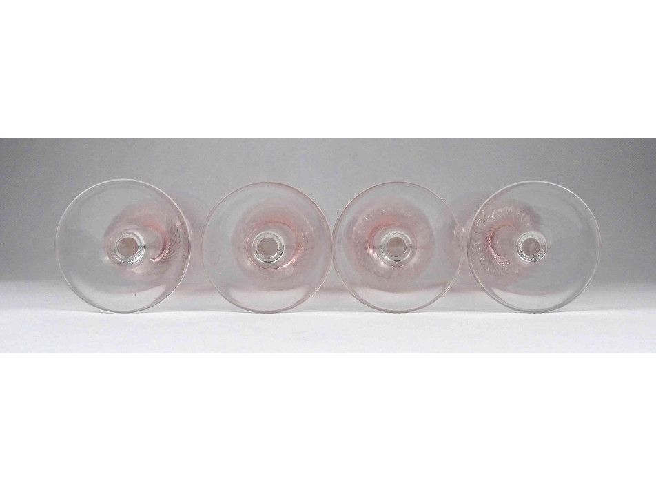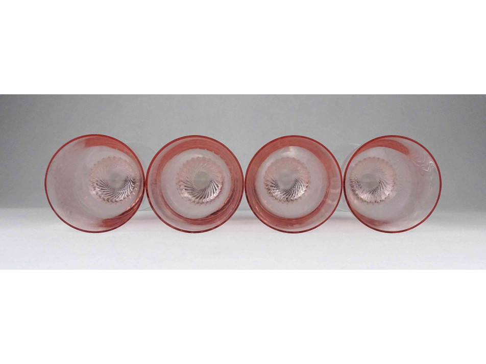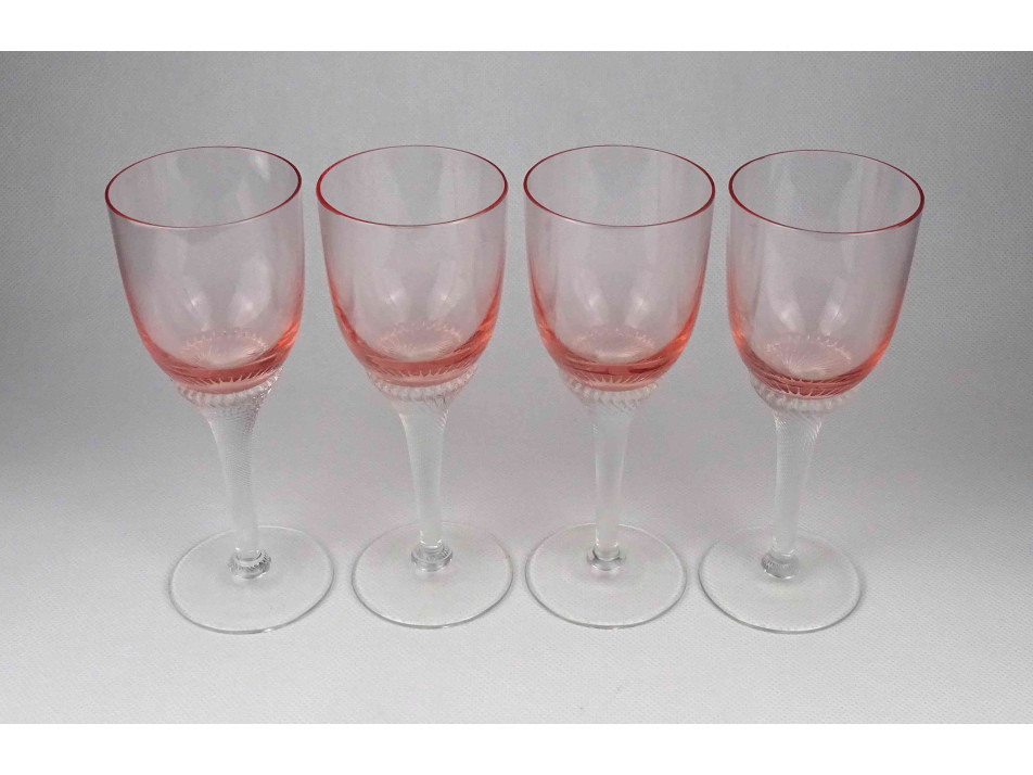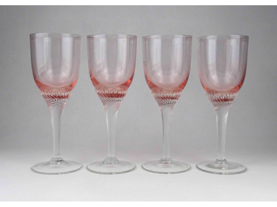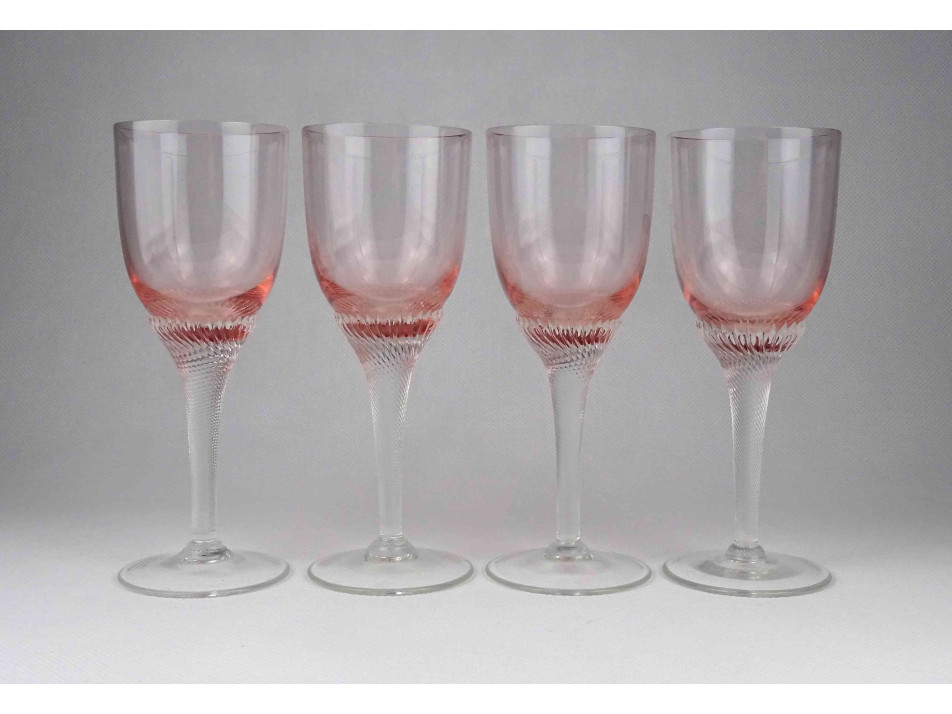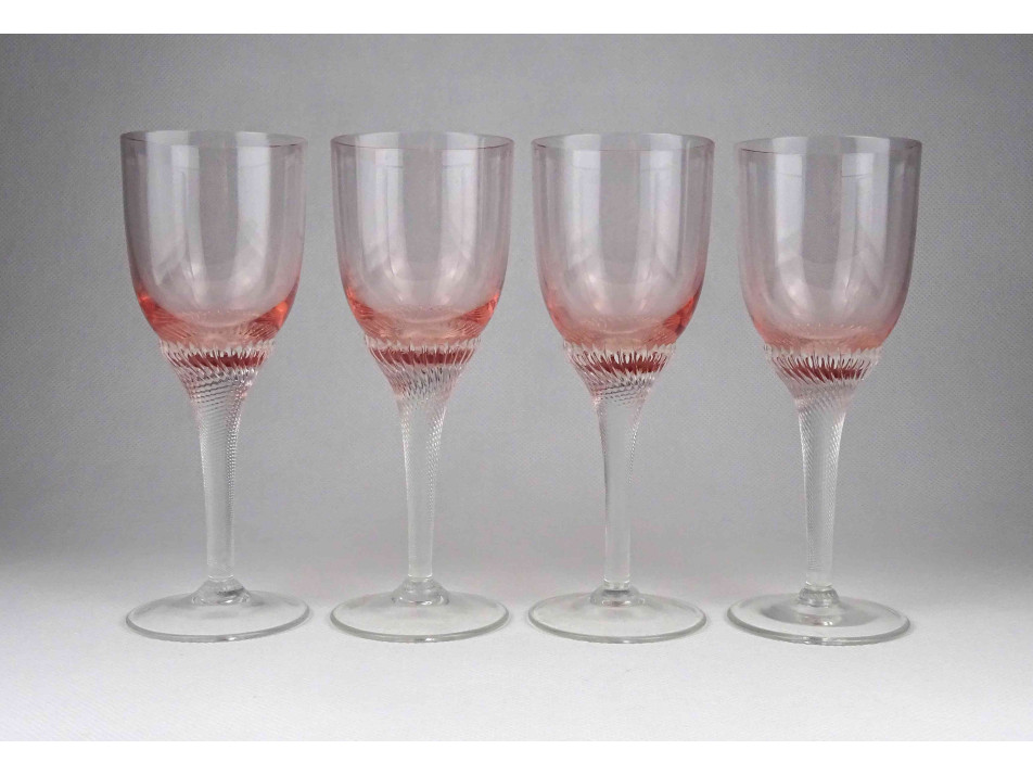 Régi, különleges kialakítású, csavart szárú, részben színezett rózsaszín talpas borospohár, üveg pohár készlet, 4 darabos.