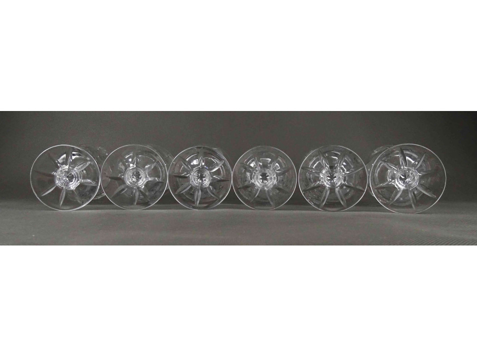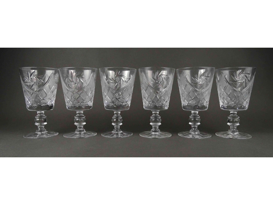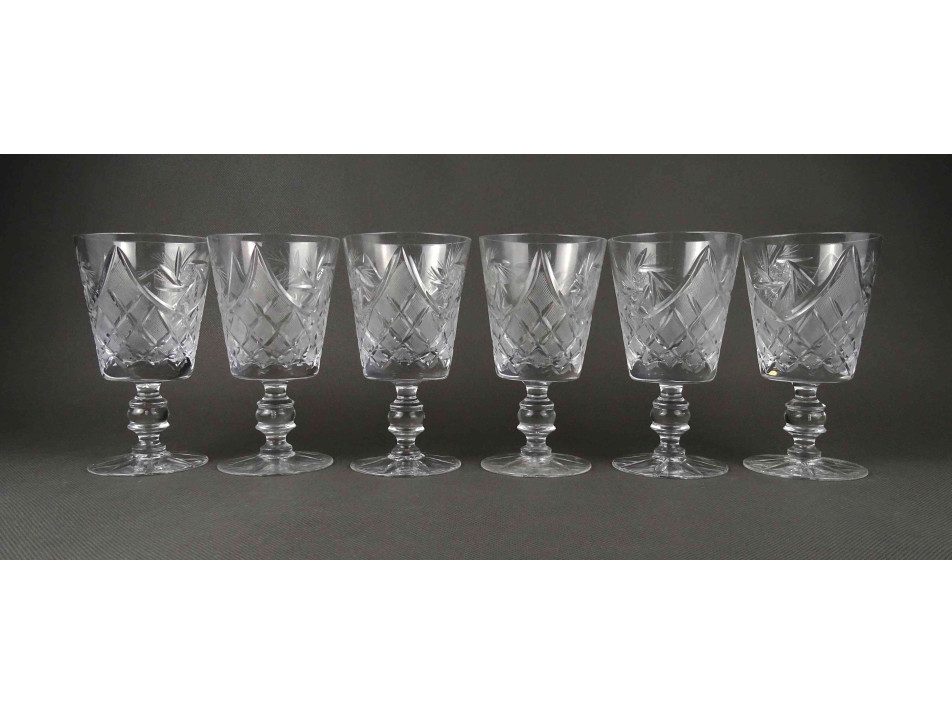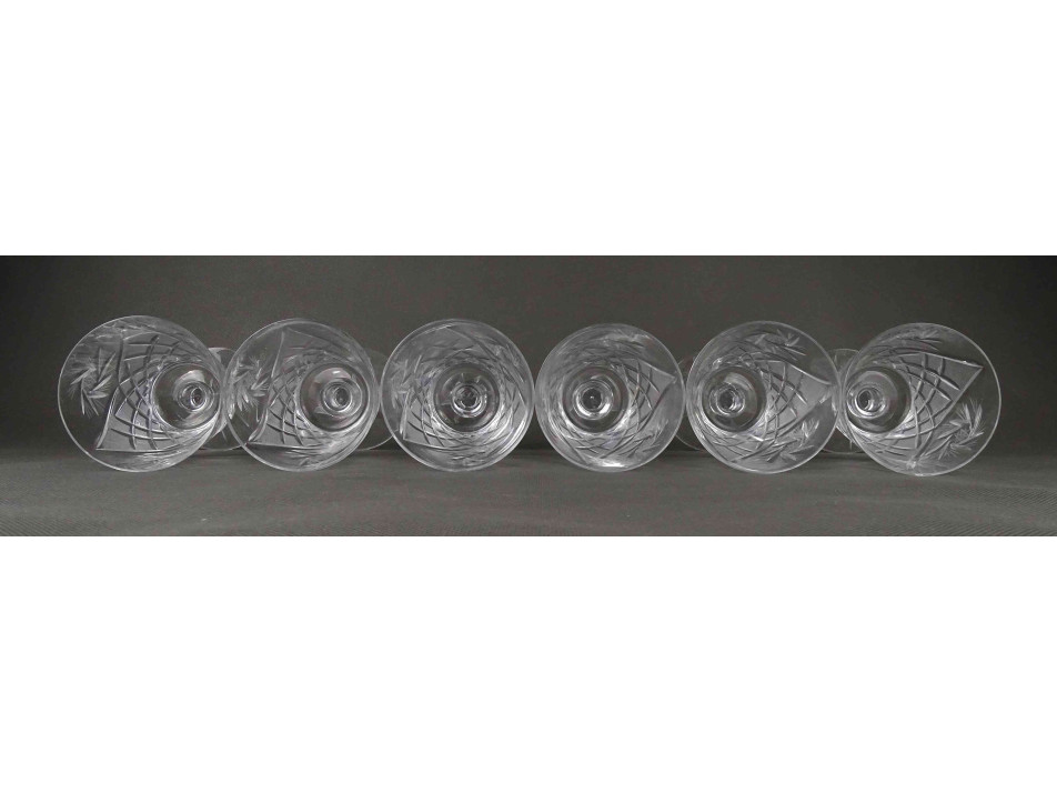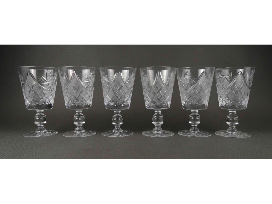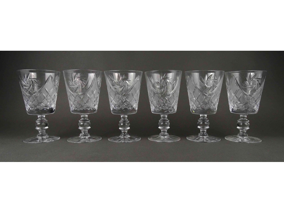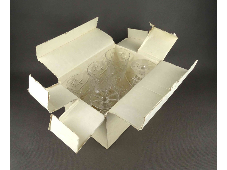 Hat darab, hibátlan állapotú, talpas boros kristály pohár, körben csiszolatokkal díszítve, eredeti dobozában.