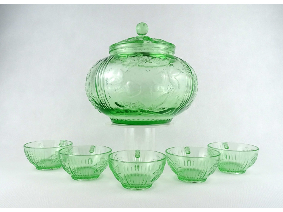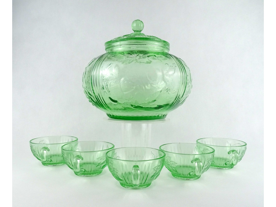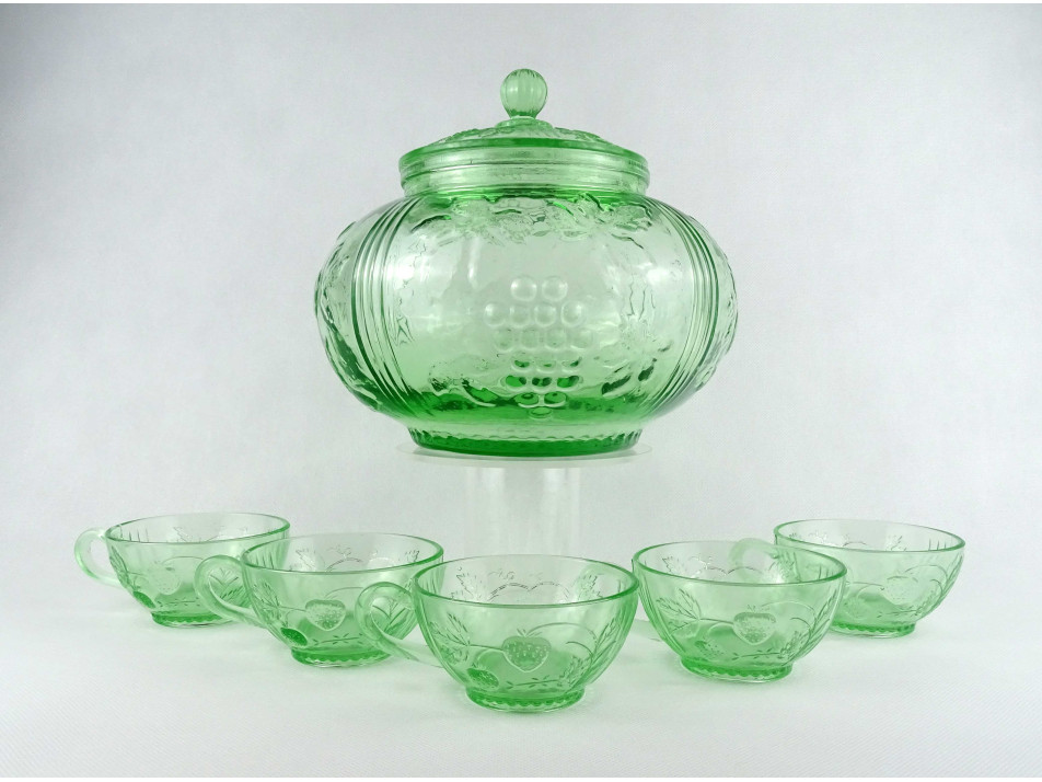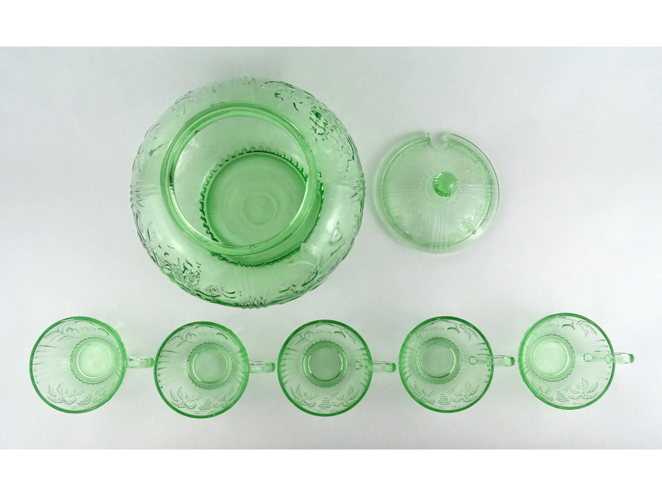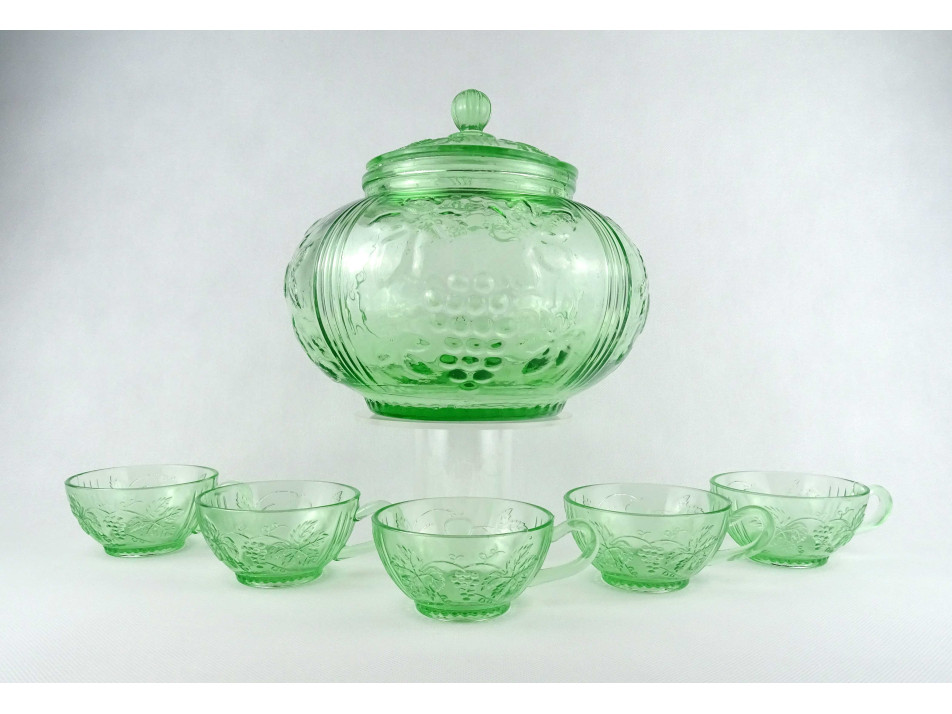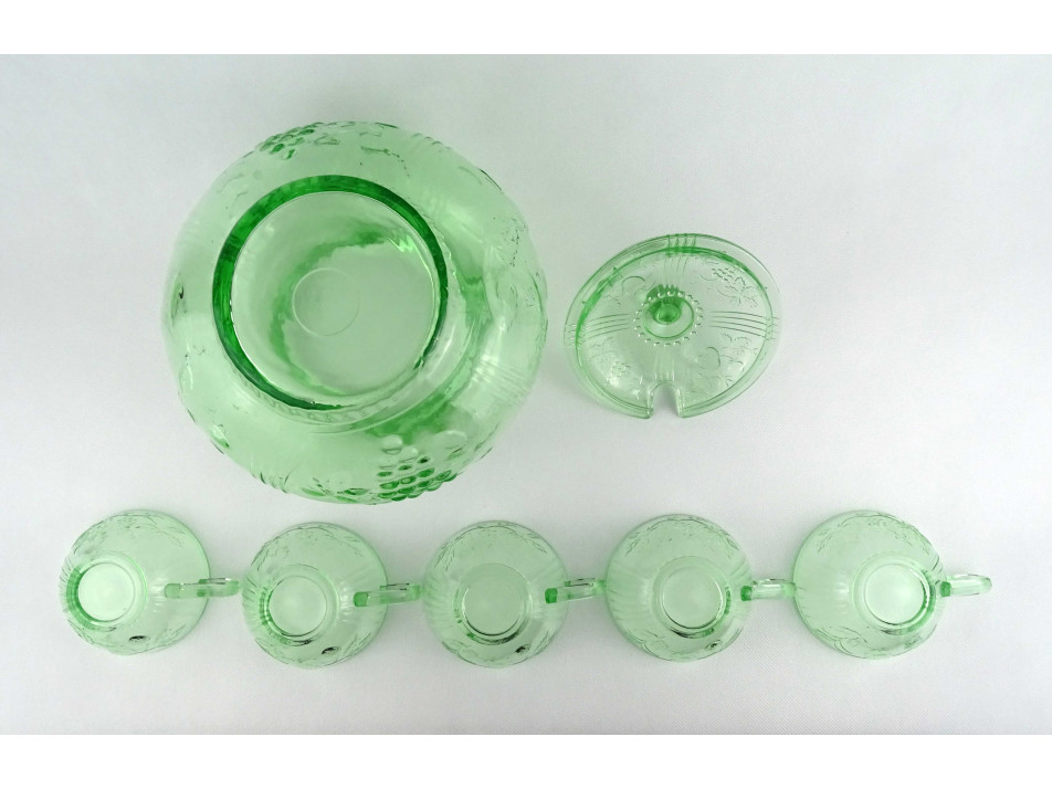 Régi, szép állapotú, zöld színű préseltüveg bólés készlet, pohár készlet. A poharak és a kínáló oldala szőlőlevél és szőlőfürt és eper motívumokkal díszített.