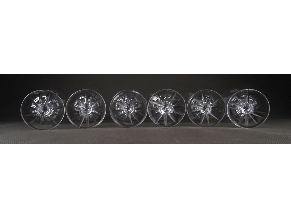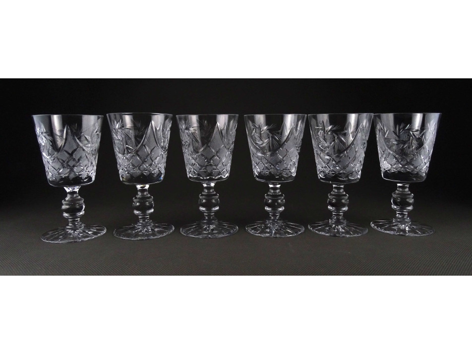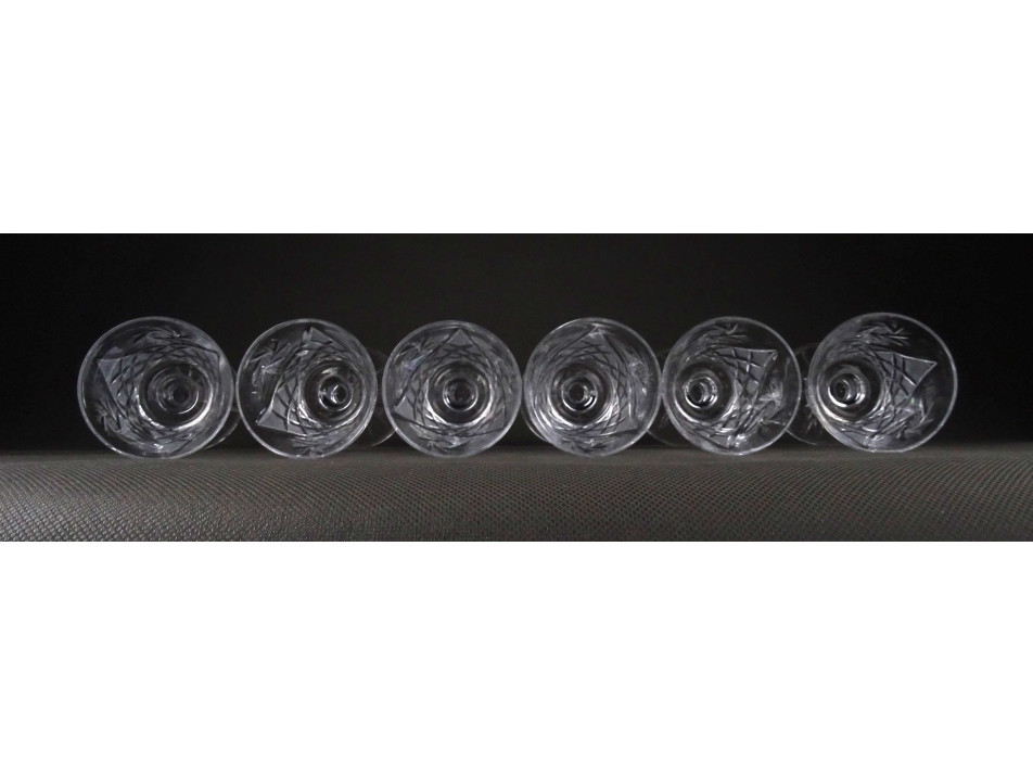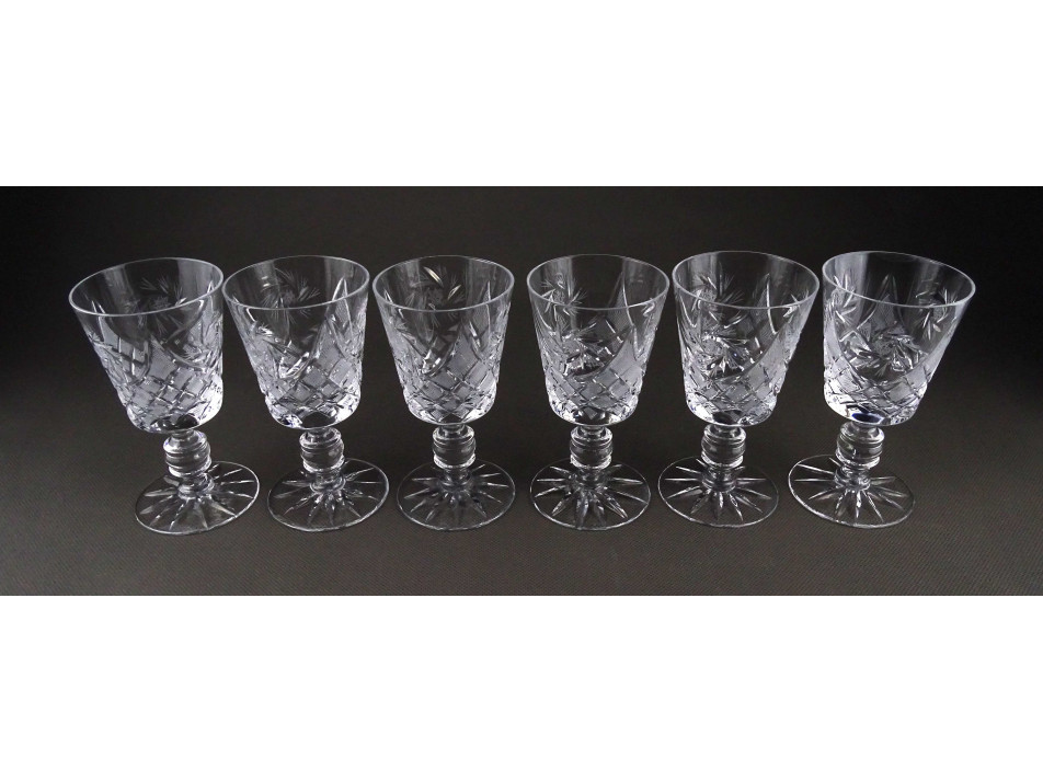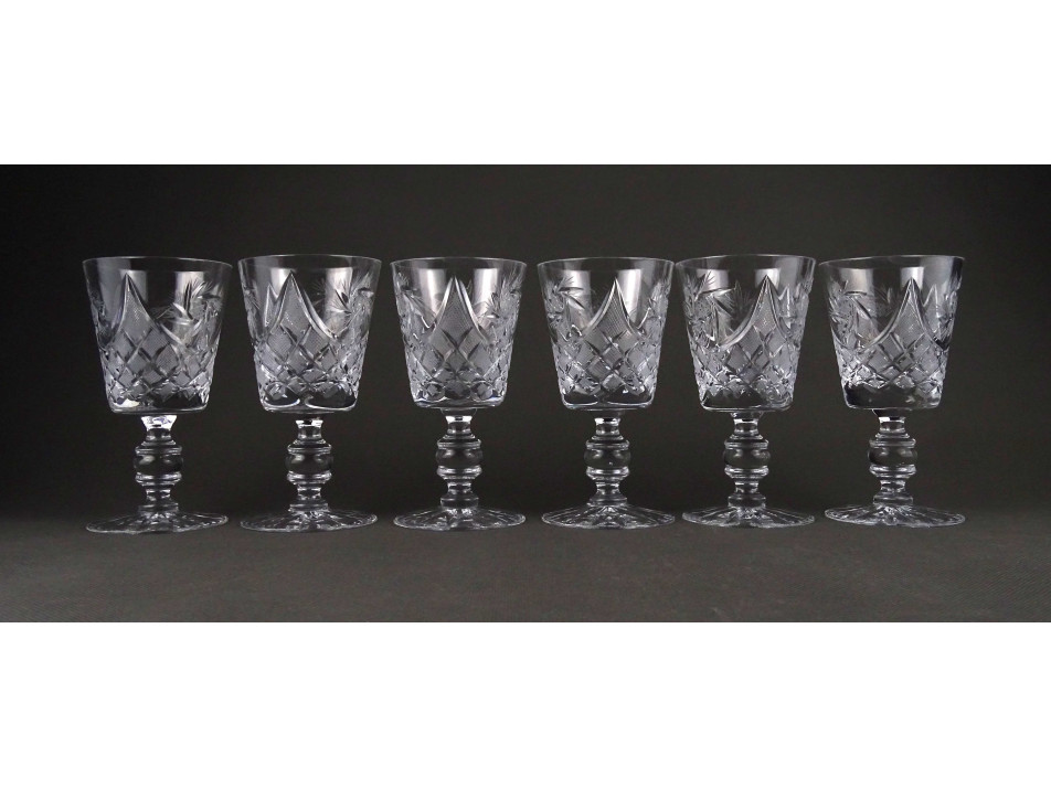 Hat darab, hibátlan állapotú, talpas boros kristály pohár körben csiszolatokkal díszítve.