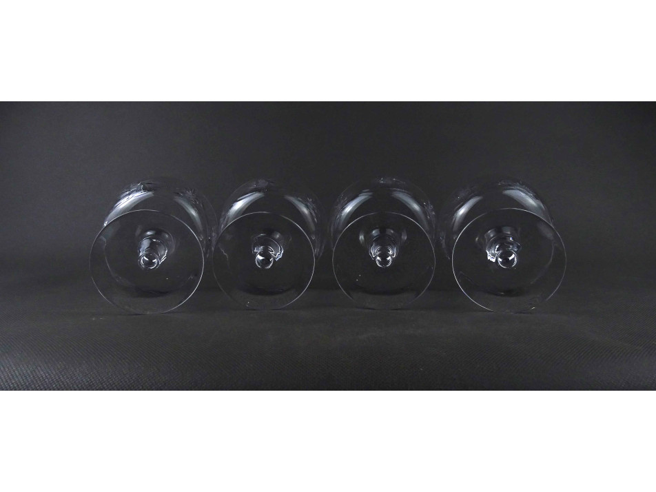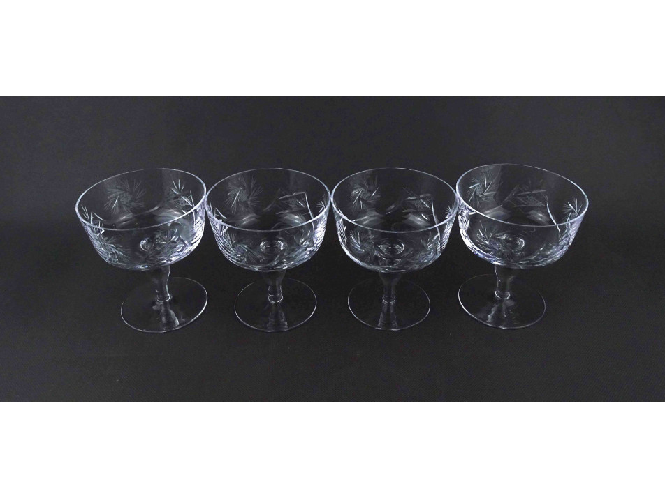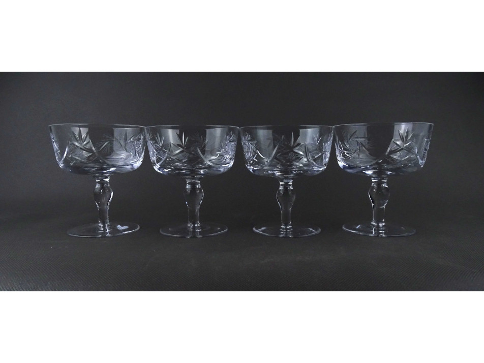 Régi, hibátlan állapotú, elegáns, körben csiszolatokkal díszített, talpas kristály pezsgős pohár készlet, négy darab.
