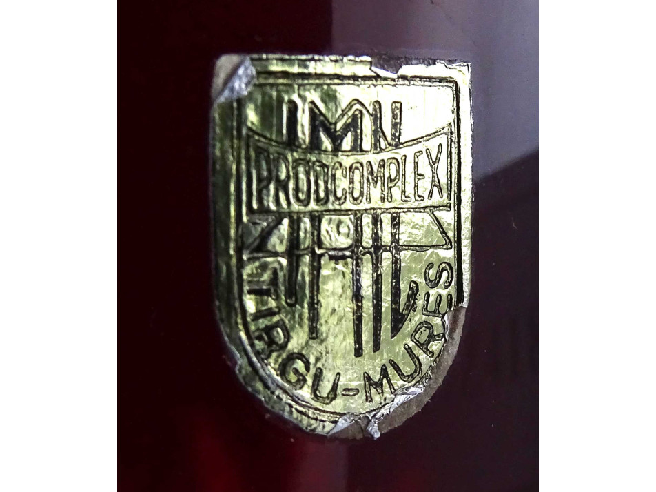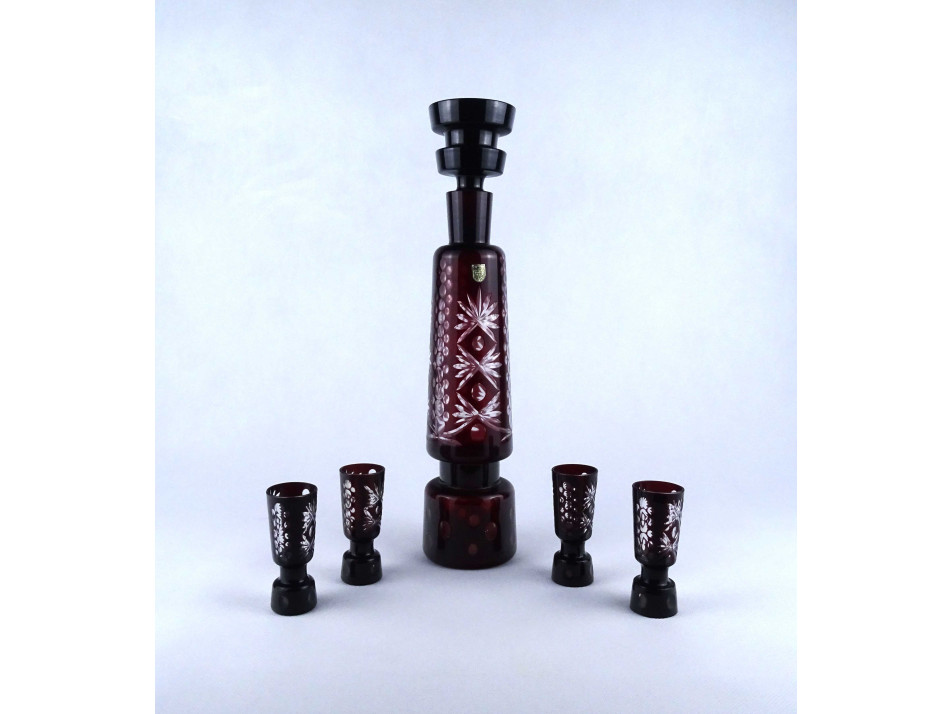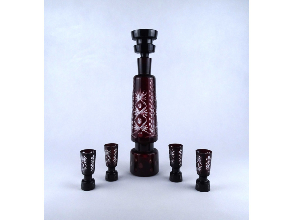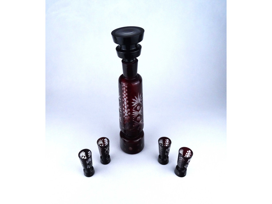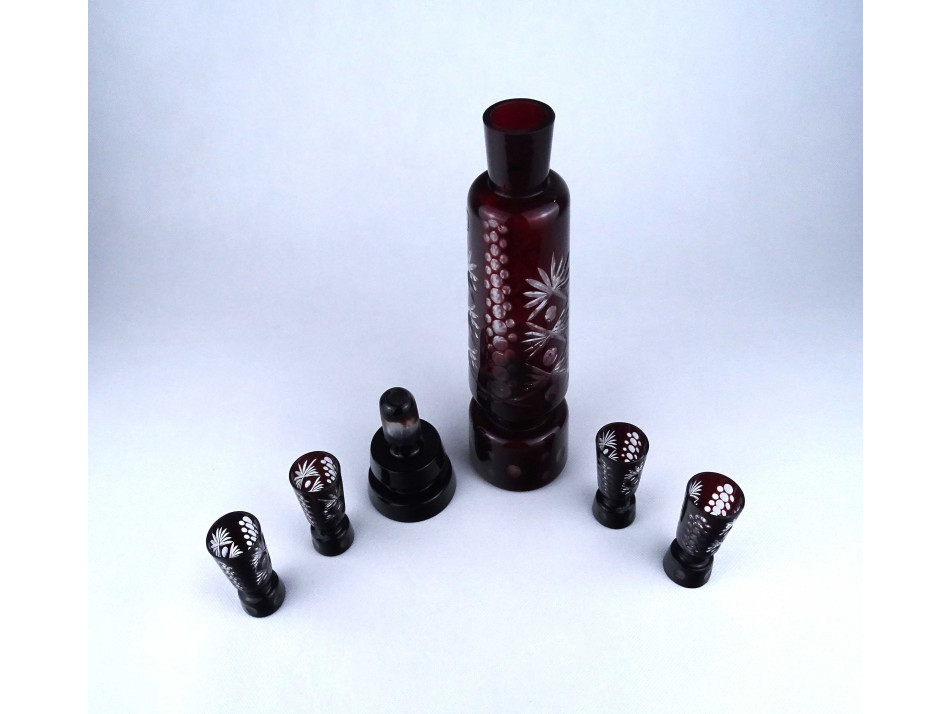 Régi, hibátlan állapotú, bordóra színezett, csiszolt üveg, italkínáló, pálinka kínáló készlet, dugós palack négy röviditalos pohárral. Asztali italkínáló, rövidital, likőr kínáló.
