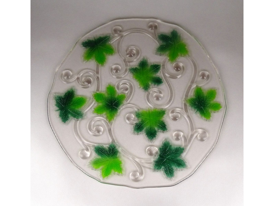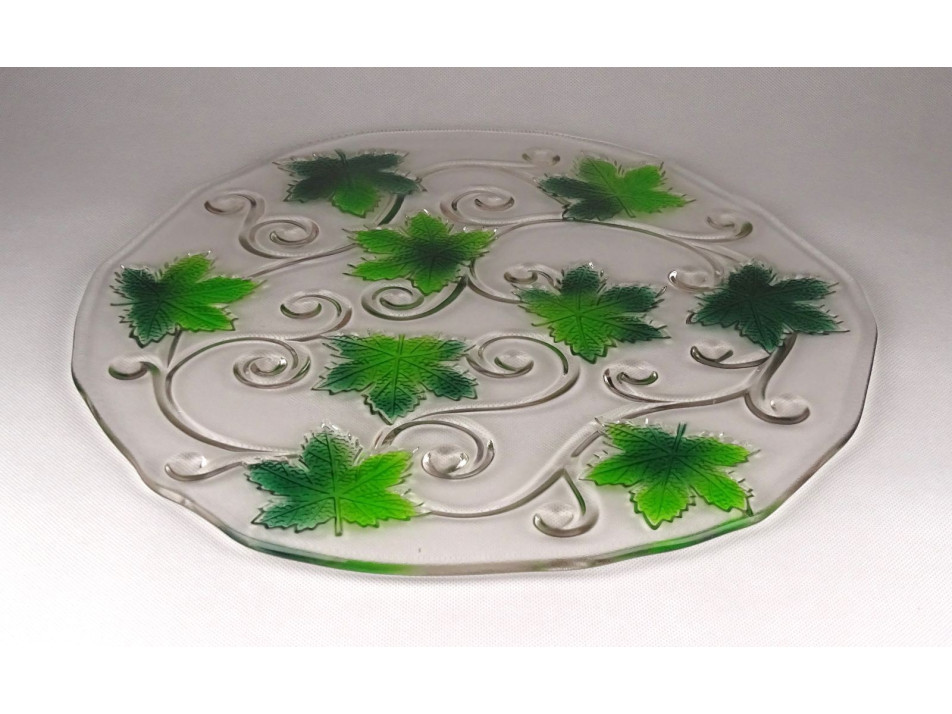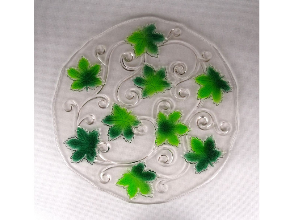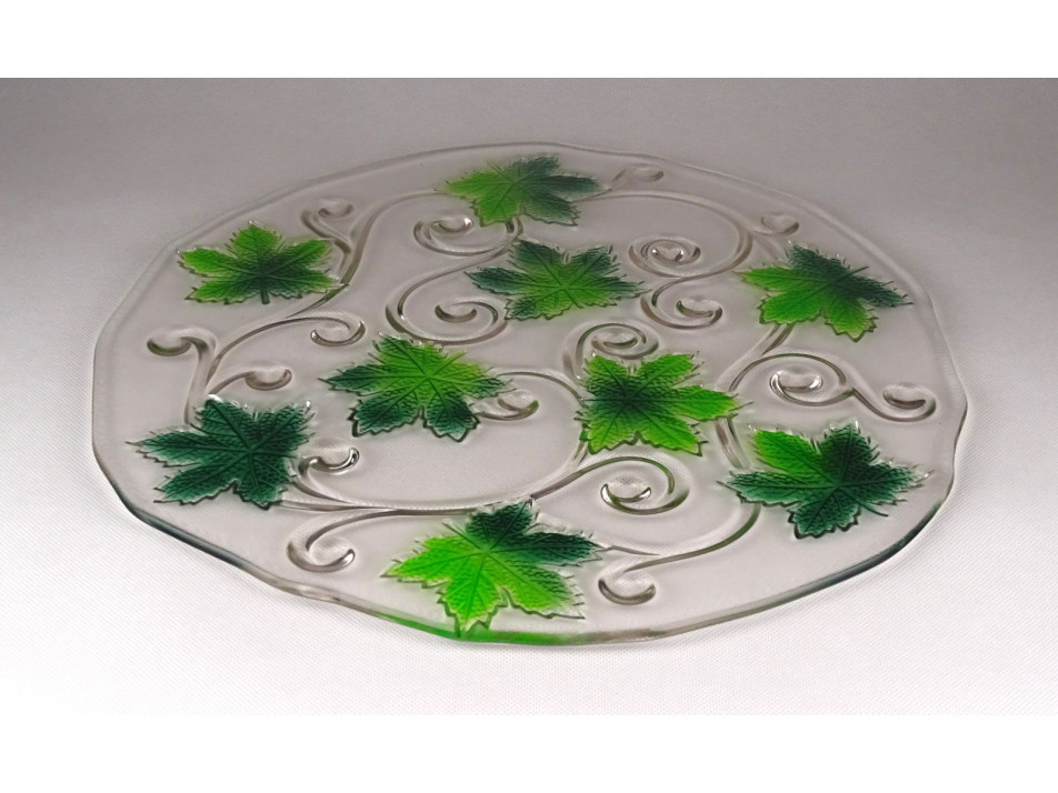 Nagy méretű, hibátlan állapotú, üveg asztalközép kínáló tál. Rajta plasztikus szőlőlevél díszítés.