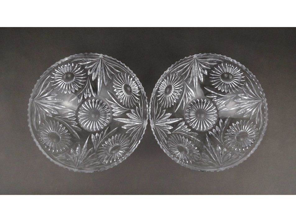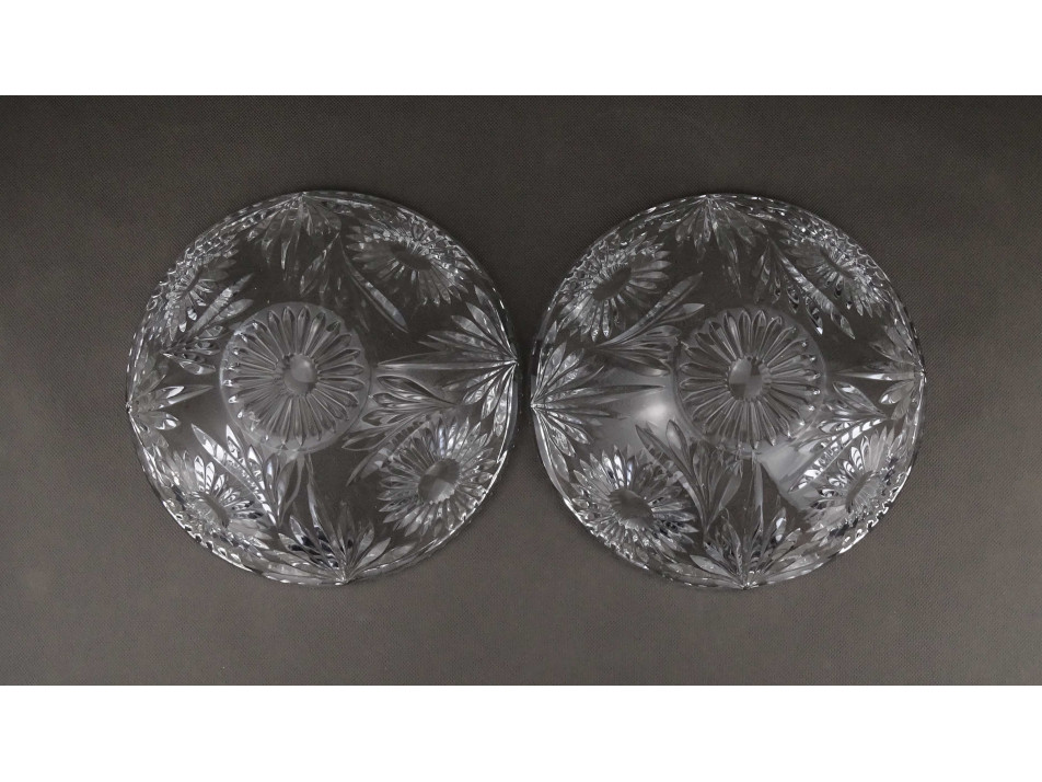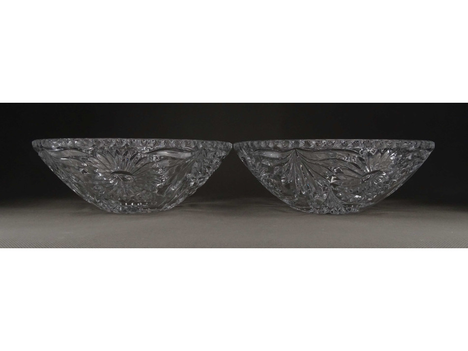 2 darab, egyforma, hibátlan állapotú, csiszolatokkal gazdagon díszített, vastag falú, nagyméretű asztalközép kínáló tál, gyümölcskínáló tál.