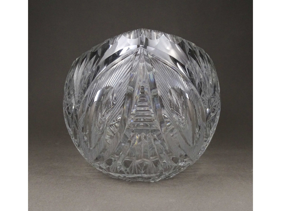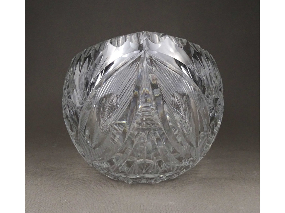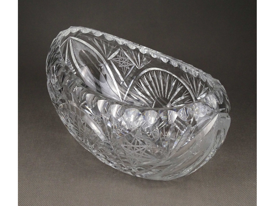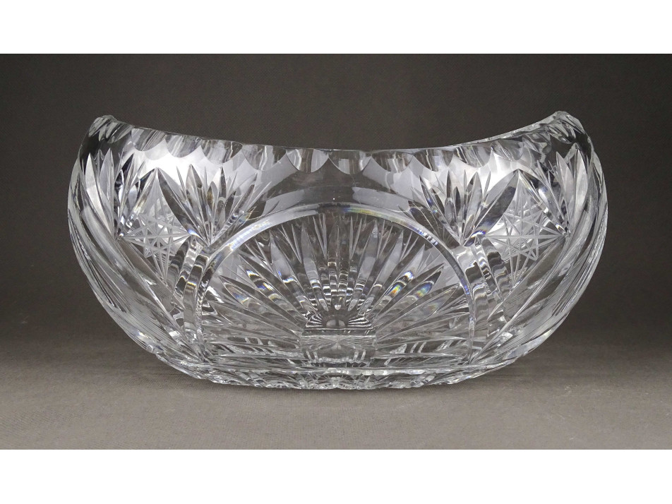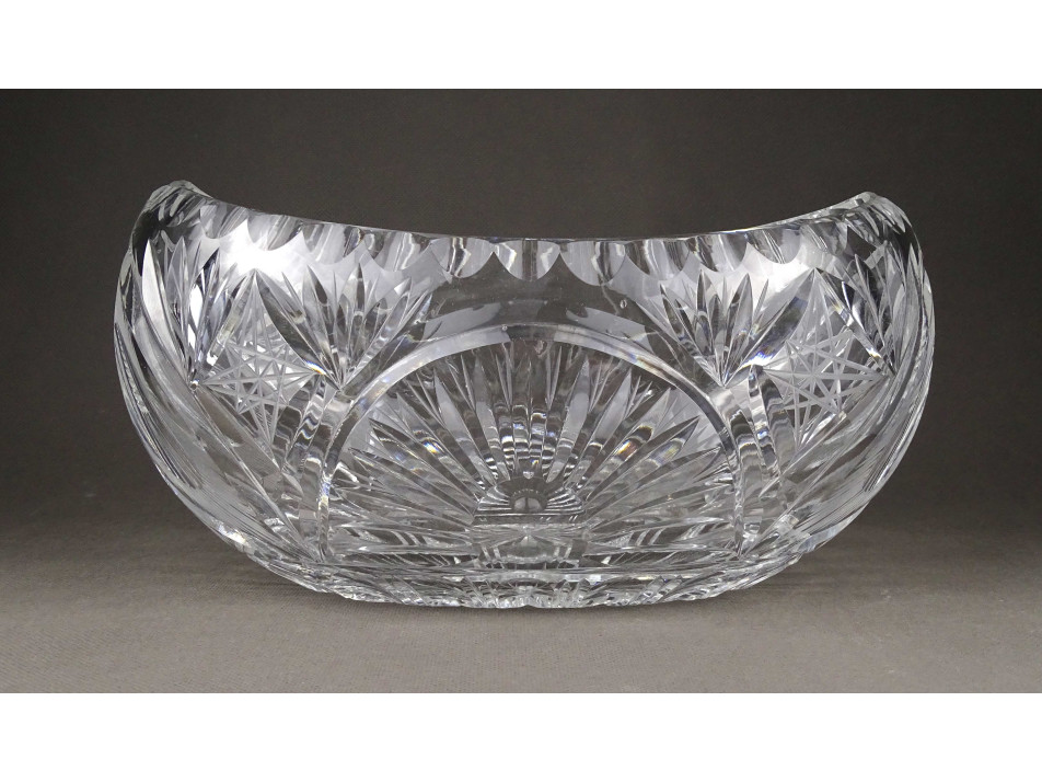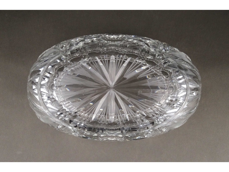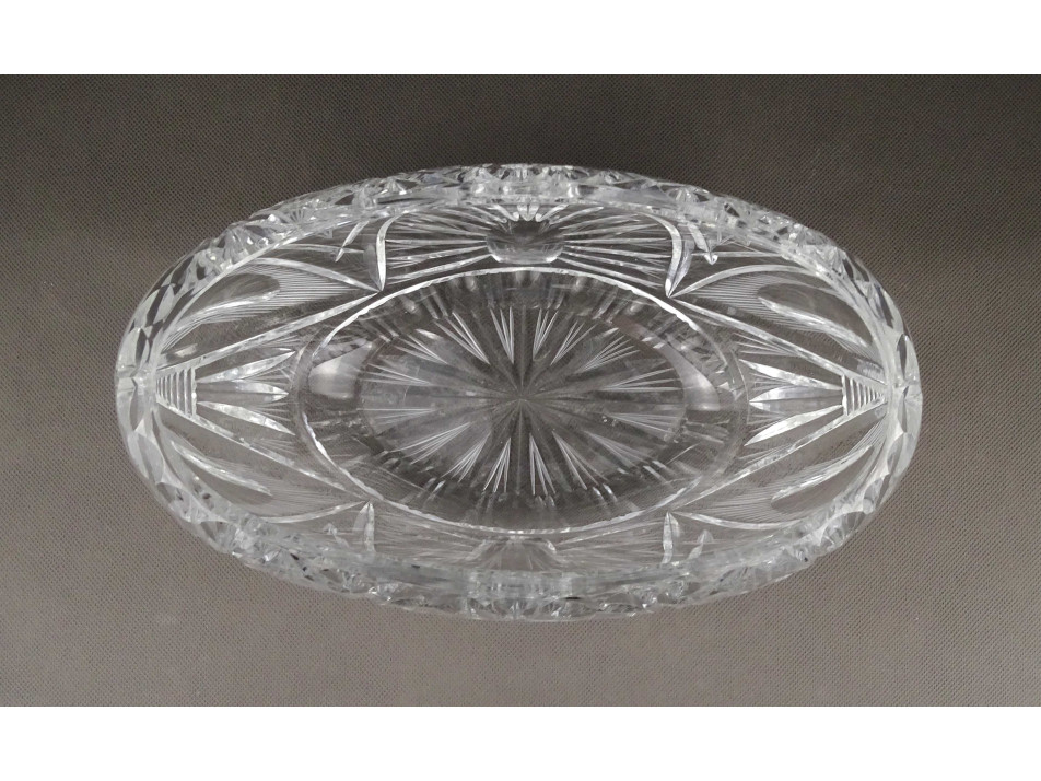Csiszolatokkal gazdagon díszített, nagy méretű, vastagfalú, gyönyörű ovális alakú kristály gyümölcstál, kínáló tál.