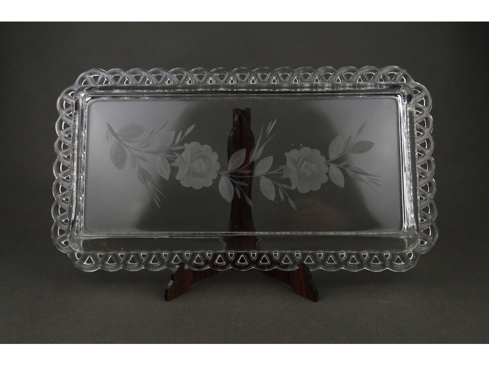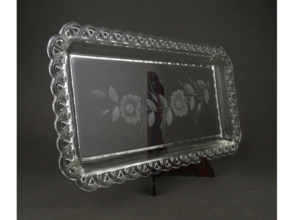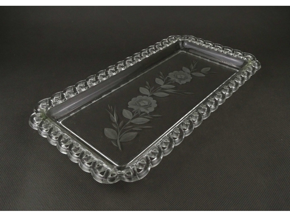 Régi rózsás csiszolt üveg tálca kínáló tál 17.5 x 32.5 cm