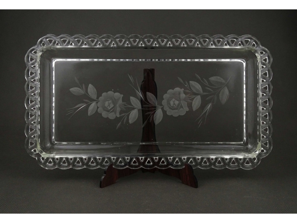 Hibátlan állapotú, vastagfalú üveg kínáló tál, tálca, alján csiszolt rózsa díszítéssel.