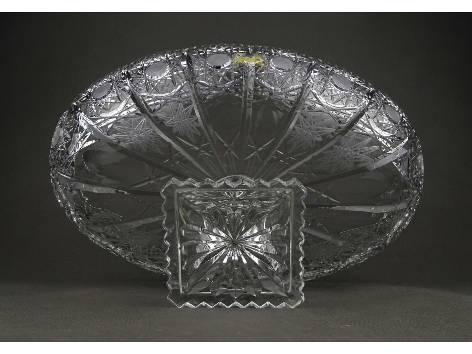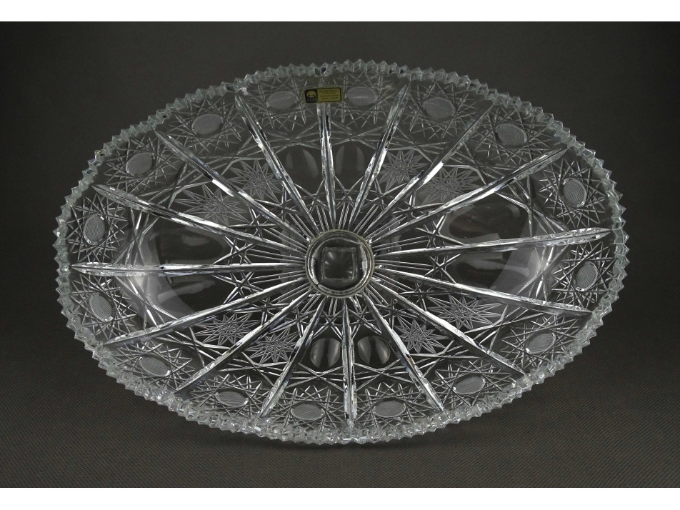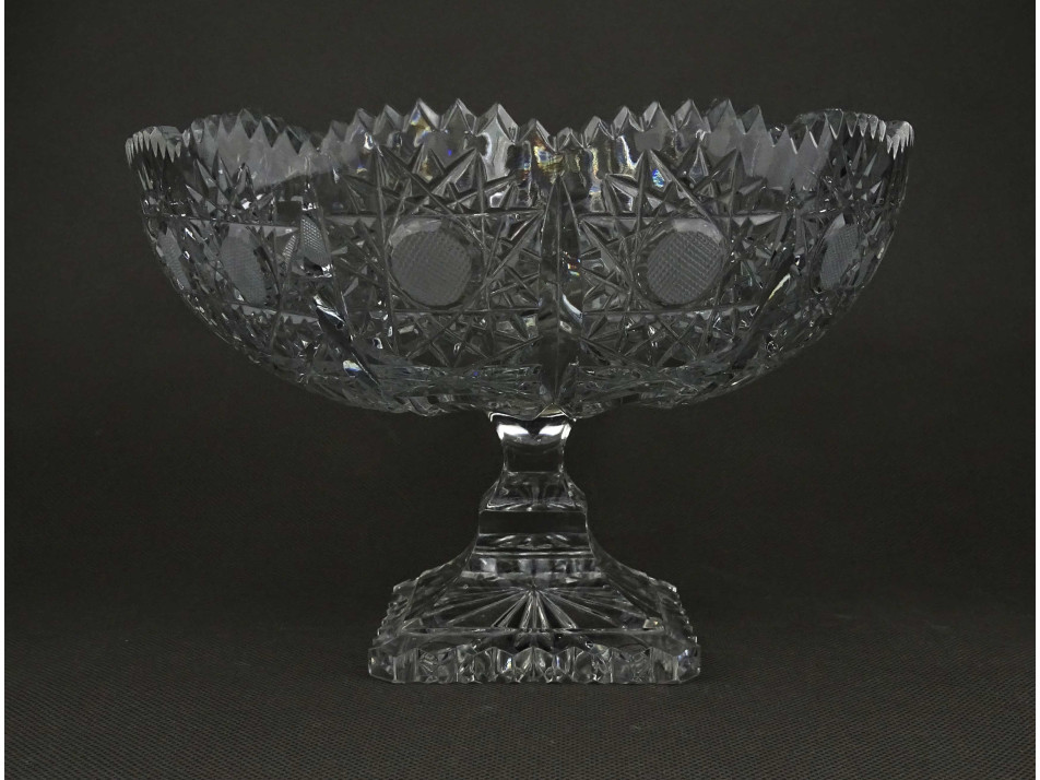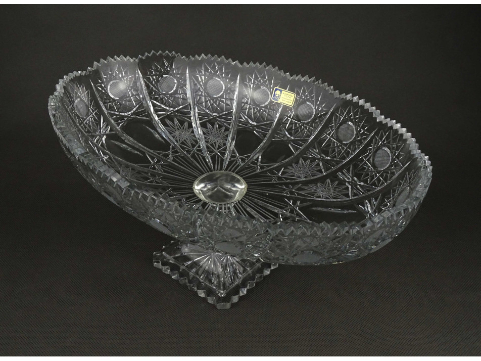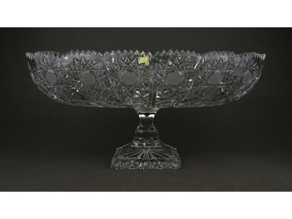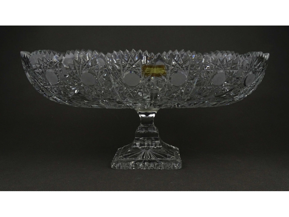 Gyönyörű, nagyméretű, csiszolatokkal gazdagon díszített, ovális alakú, talpas kristály tál, kínáló tál. Asztalközép kínáló tál, gyümölcskínáló tál.