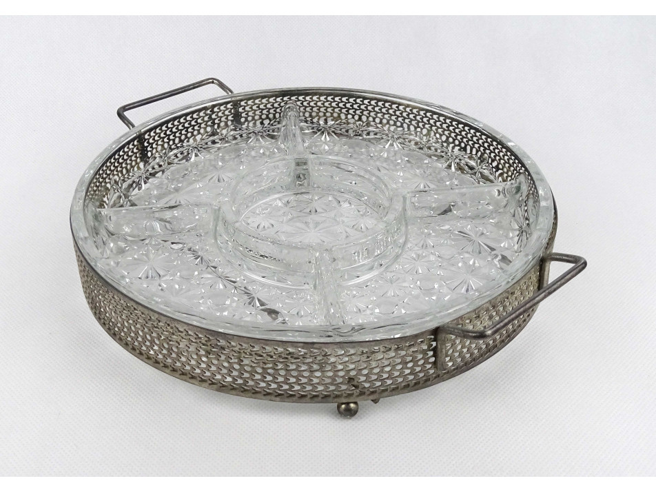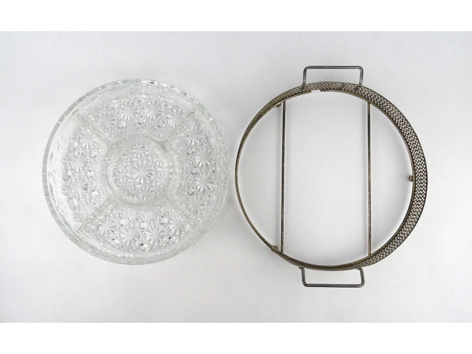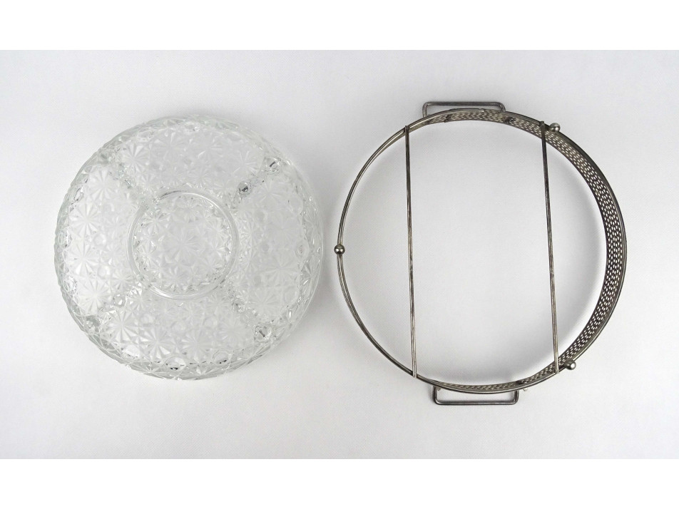 Hibátlan állapotú, füles, fém keretbe foglalt, öt részre osztott üveg asztalközép kínáló tál, üveg tál.