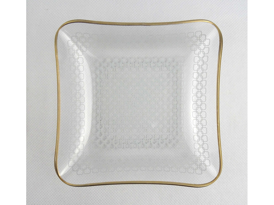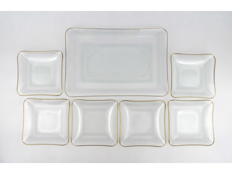 Retro, hibátlan állapotú, hat személyes, szögletes alakú, vékonyfalú, aranyozott peremű, mid century design festett üveg süteményes készlet, 7 darab.