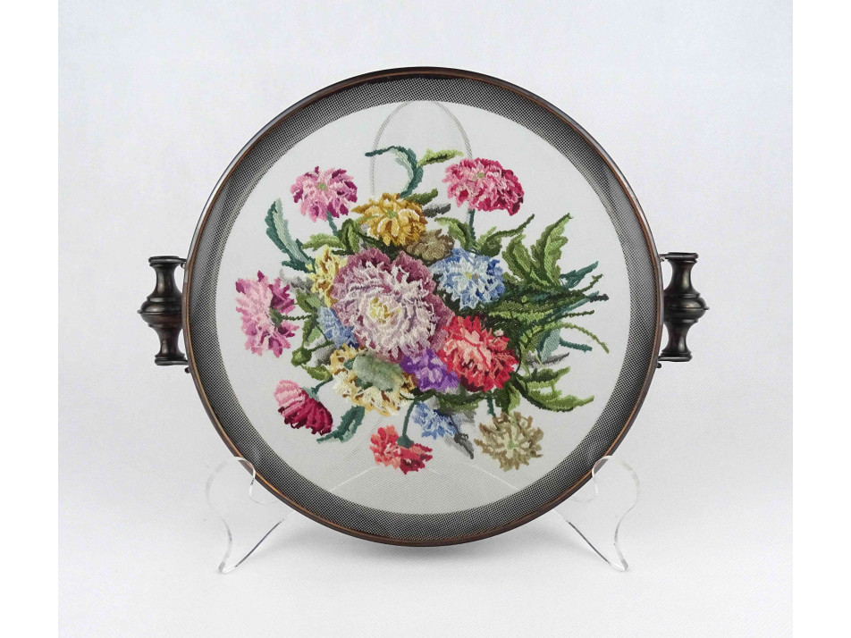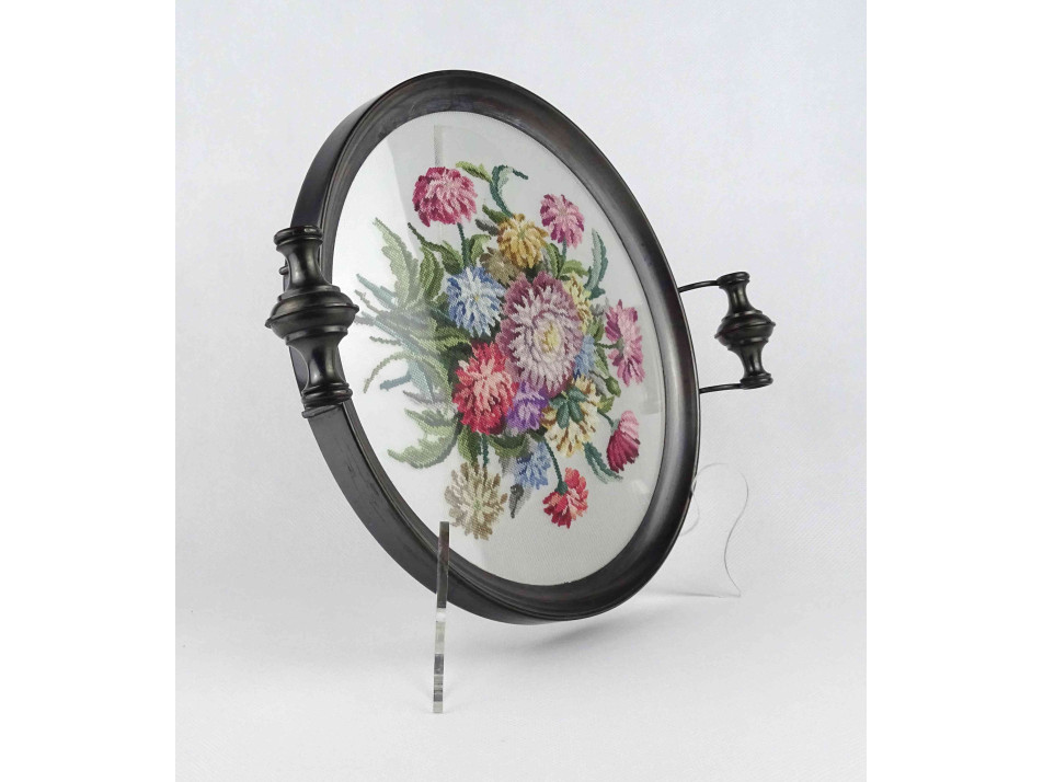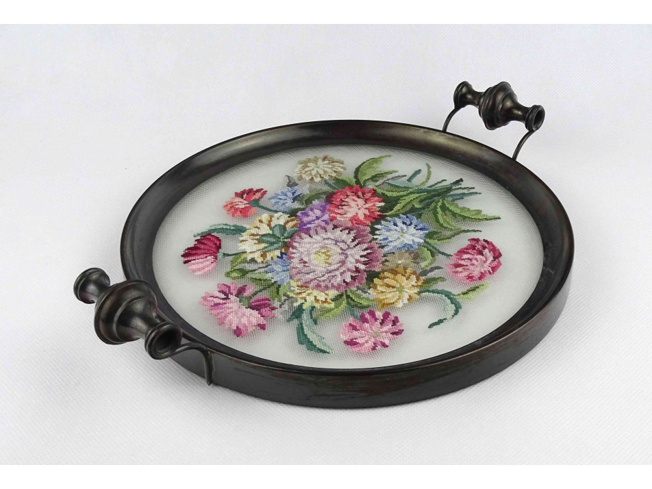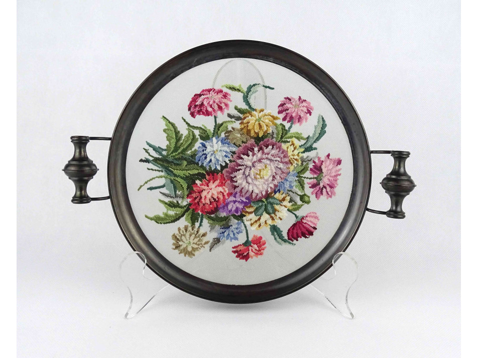 Hibátlan állapotú, réz keretes üveg tálca. Két üveglap között hímzett virágcsokor díszítés.