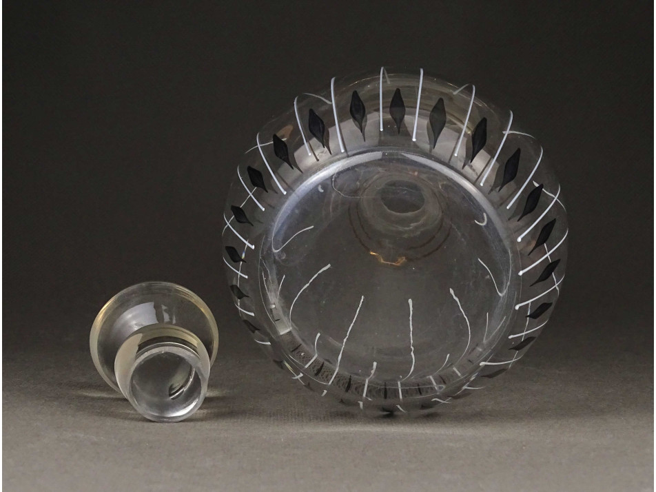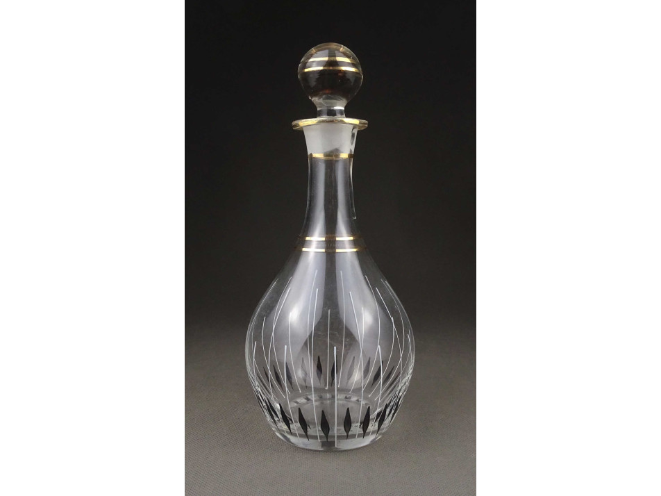 Retro, hibátlan állapotú, asztali bor, likőr vagy pálinka kínáló üveg palack. Kisméretű dugósüveg. Oldalát festett, aranyozott díszítések láthatók.
