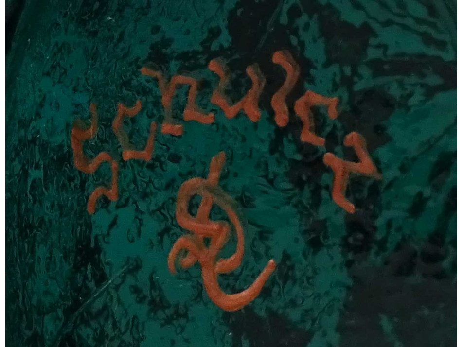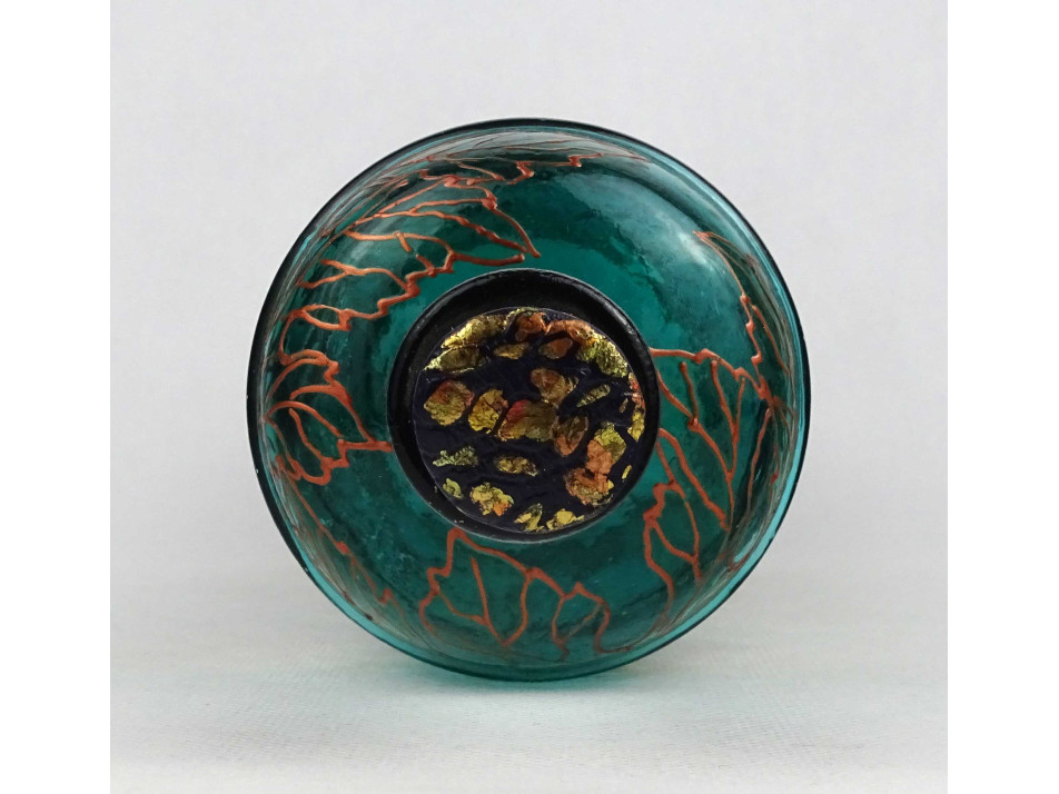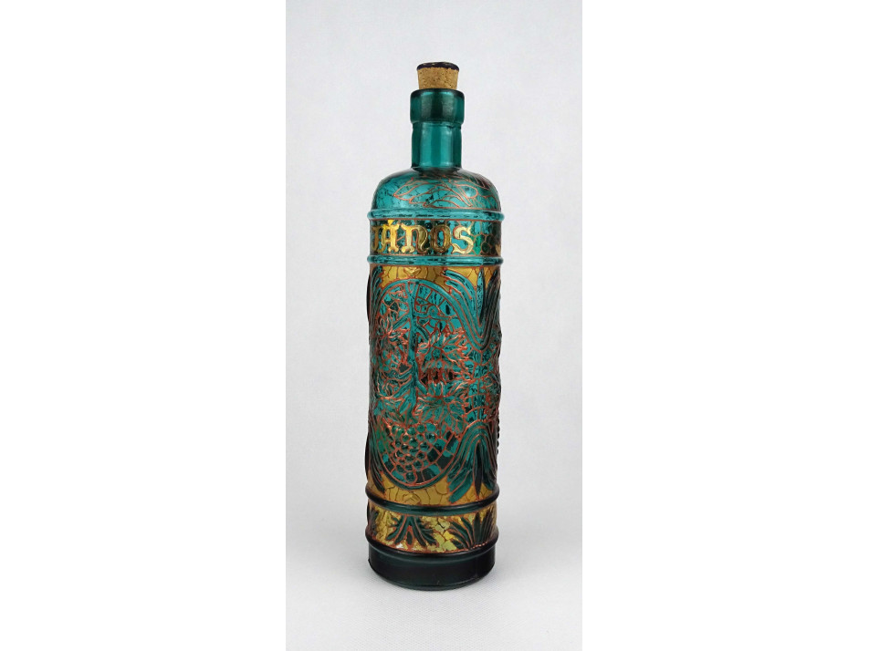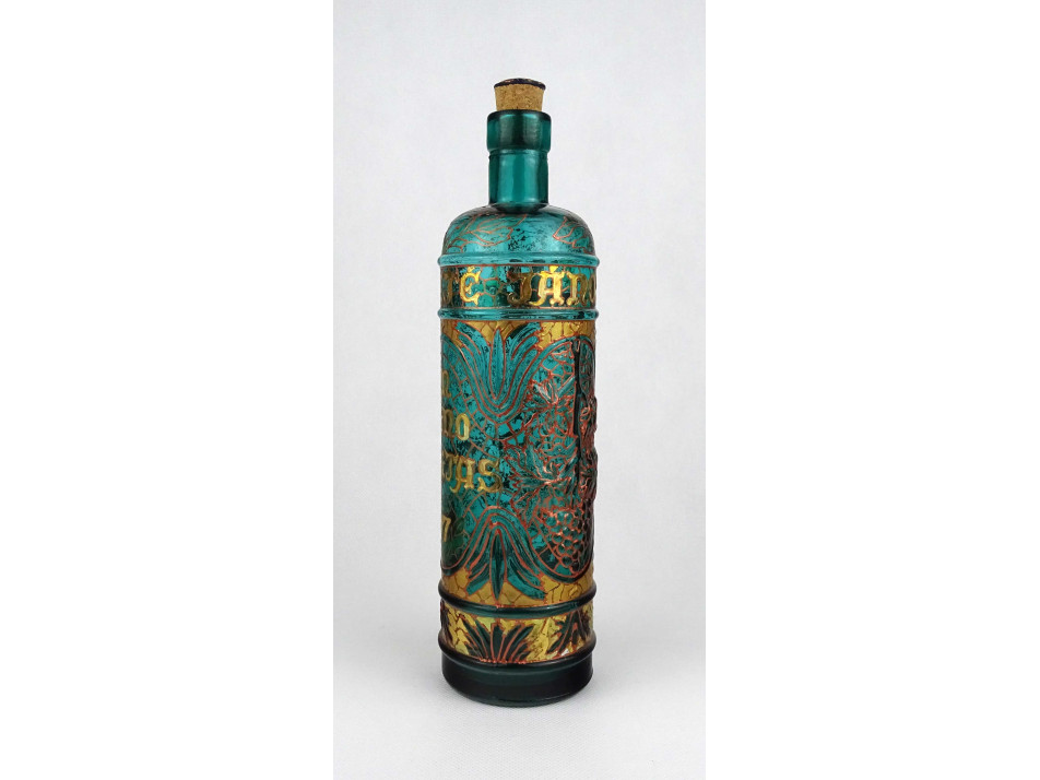 Kézműves, festett üveg italos palack. Teljes felületén aprólékos szőlő és szőlőlevél mintával borított, türkiz zöld - arany színű üvegfestékkel, kézzel festett üveg boros palack, kézműves lakberendezési tárgy.