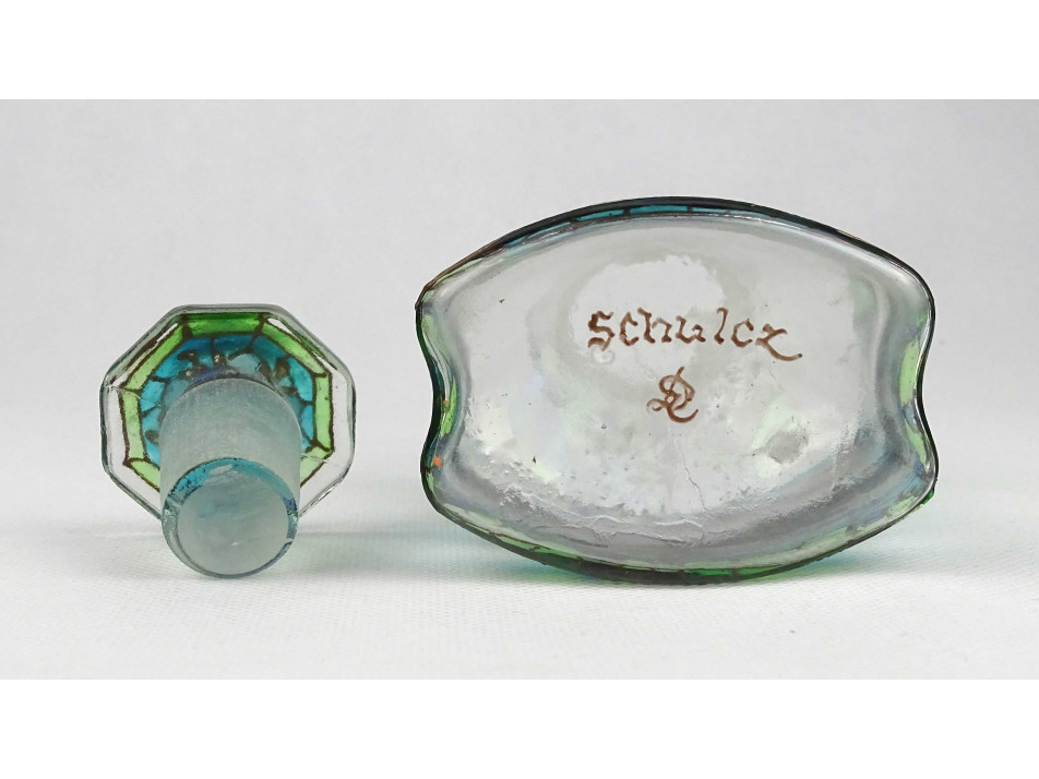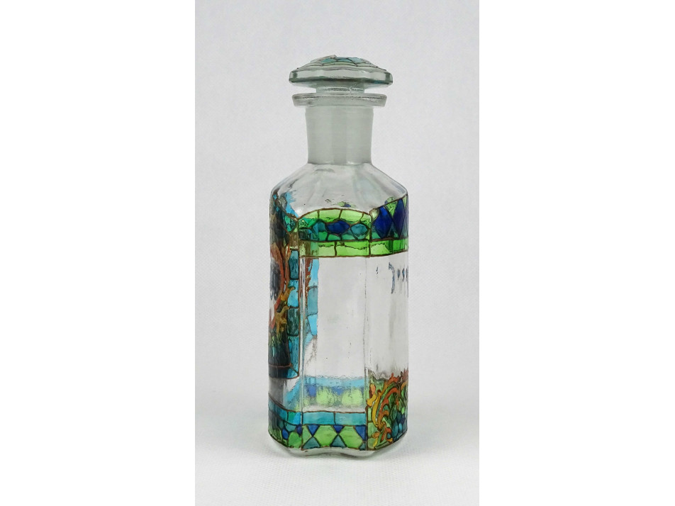 Kézműves festett patika üveg. Teljes felületén aprólékos mintával borított, kék - türkiz - zöld - arany színű üvegfestékkel, kézzel festett üveg palack, kézműves lakberendezési tárgy.