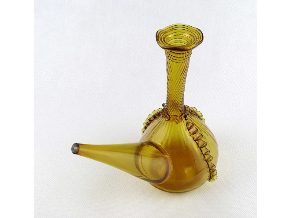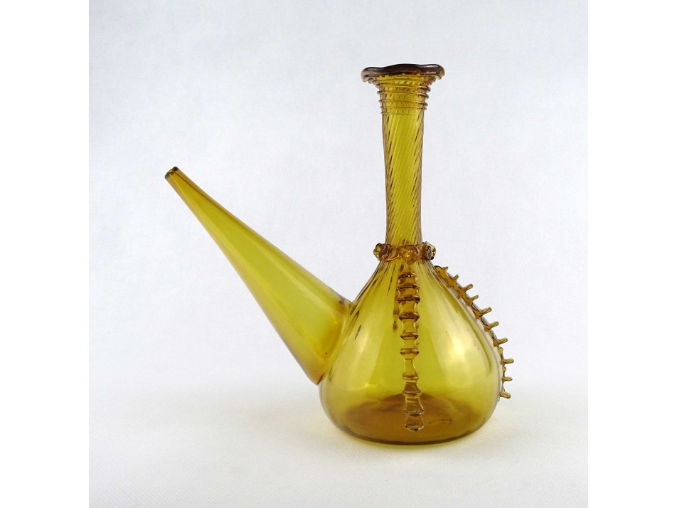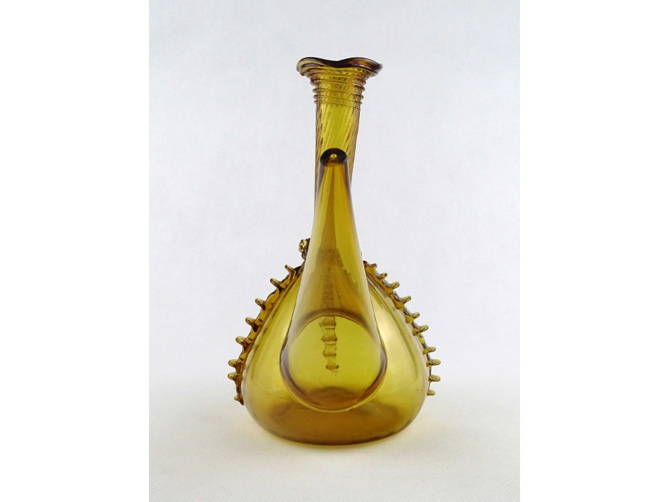 Gyönyörű, borostyánsárga színű kézműves fújtüveg kiöntő, díszüveg. Történelmi üvegeket idéző kézműves rátét, mintákkal díszített, vékonyfalú fújt üveg tárgy. Az alján a fújtüvegekre jellemző szakításnyommal.