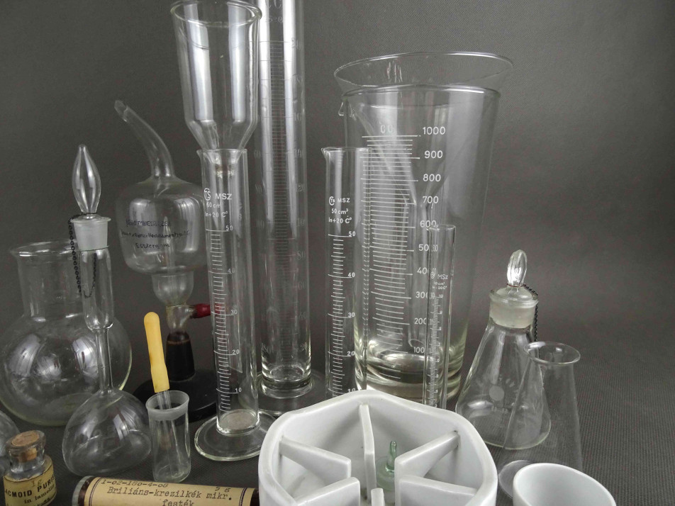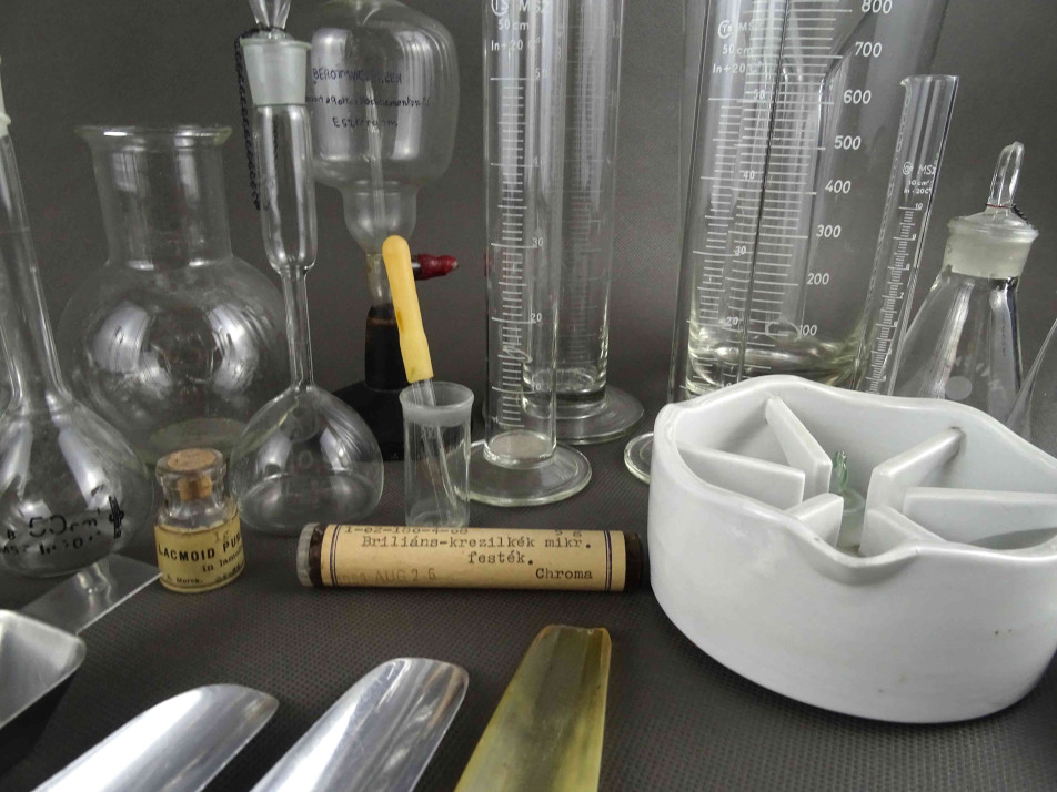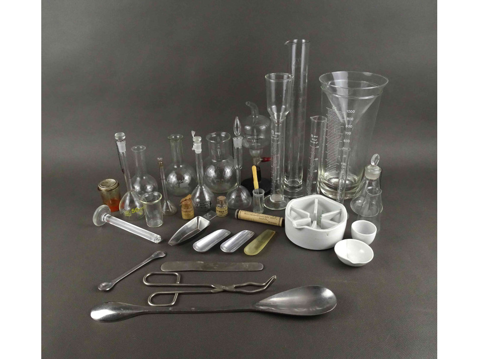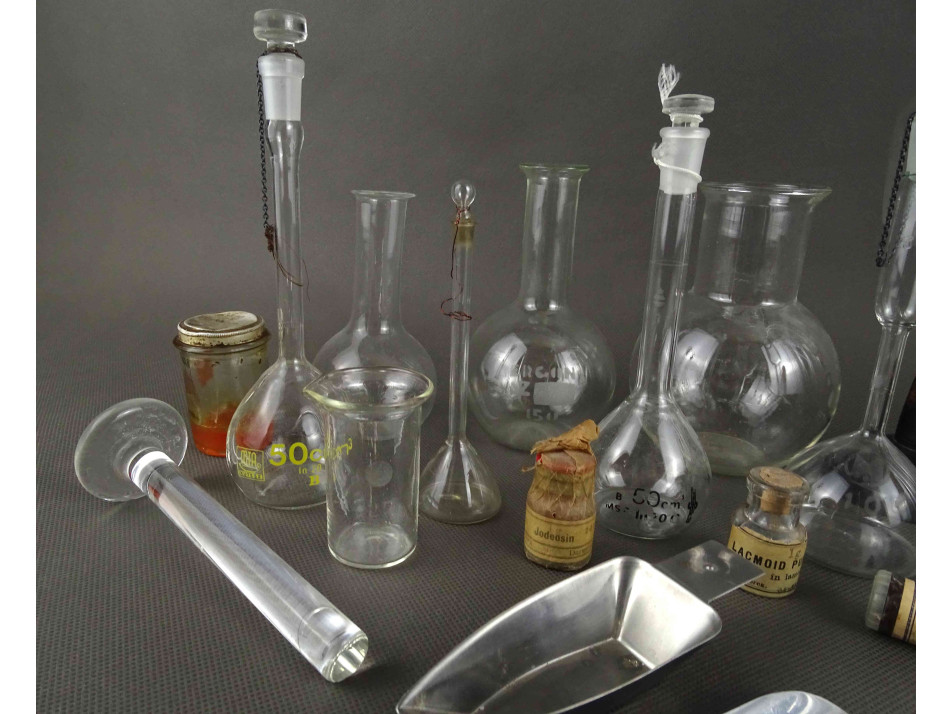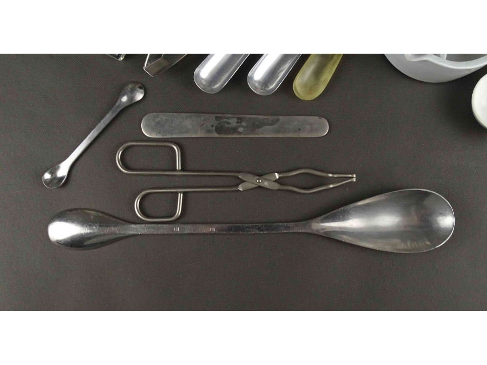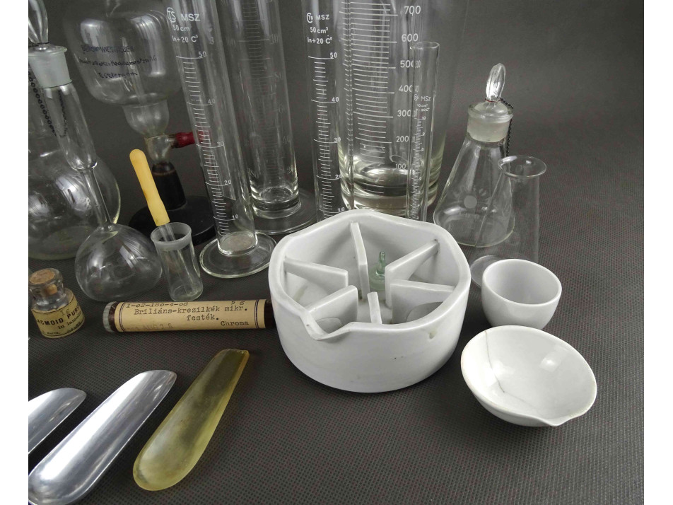 Régi laboratóriumi eszköz csomag. Lombik üvegek, mérőpoharak, üvegtölcsérek, fém fogók és kanalak, porcelán tálkák, lezárt üvegcsék és sok kiegészítő gyógyszertári laboratóriumból. 36 darab egyben.