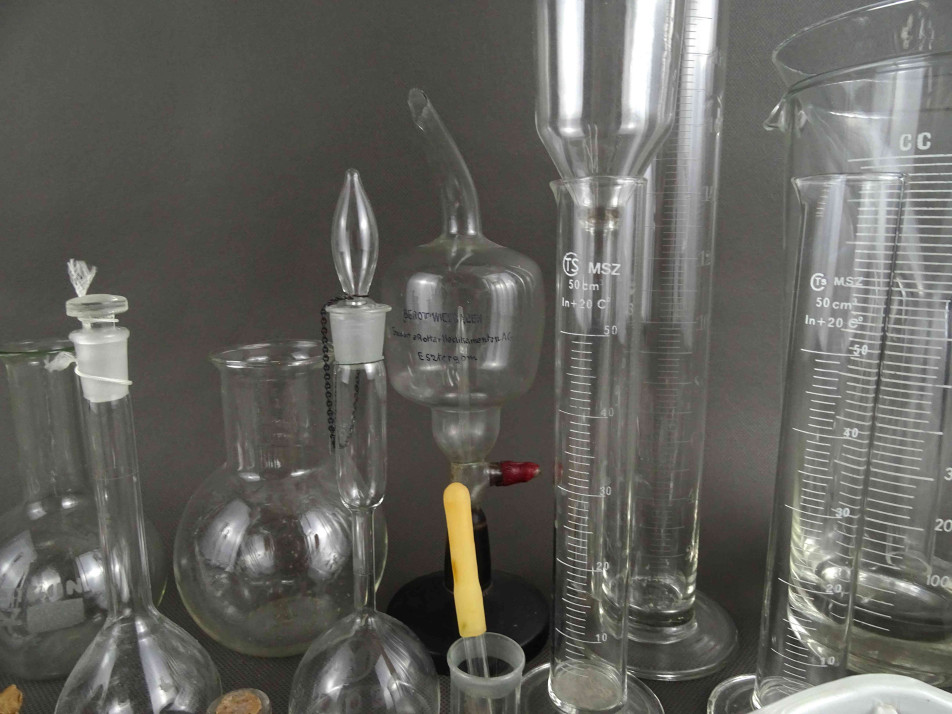 Régi laboratoriumi lombik üvegek és fém eszközök 36 darabos csomag