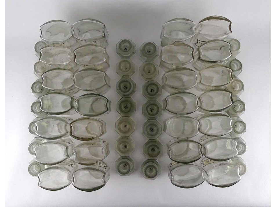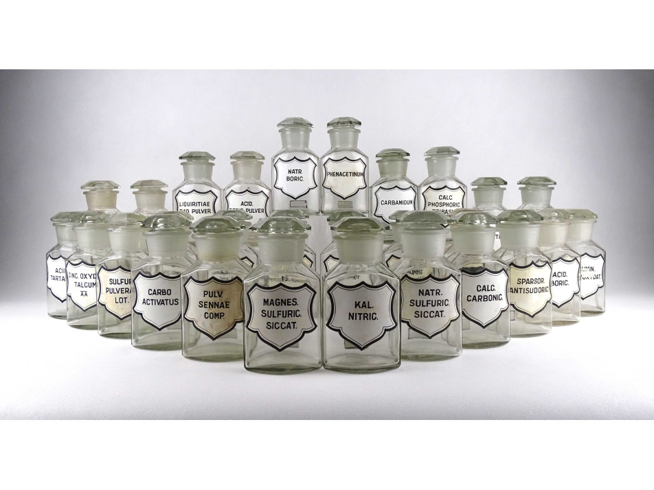 Régi, hibátlan állapotú, nagyméretű csiszolt dugós gyógyszertári üveg, patikaüveg csomag. 28 darab különböző feliratú patika tégely.