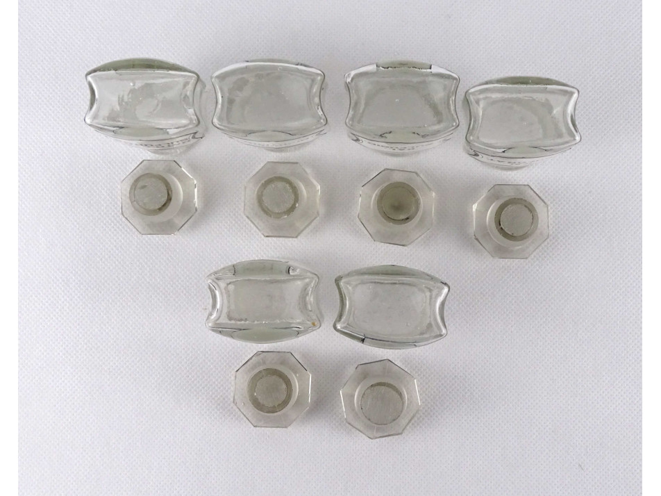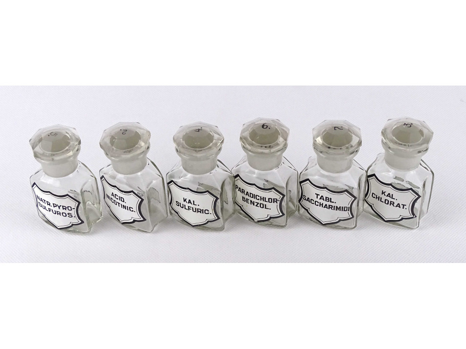 Régi, hibátlan állapotú, kisméretű, átlátszó, csiszolt dugós gyógyszertári üveg, patikaüveg csomag. 6 darab különböző feliratú patika tégely.