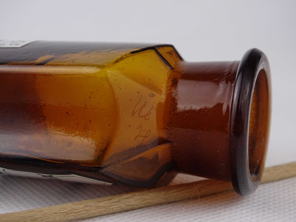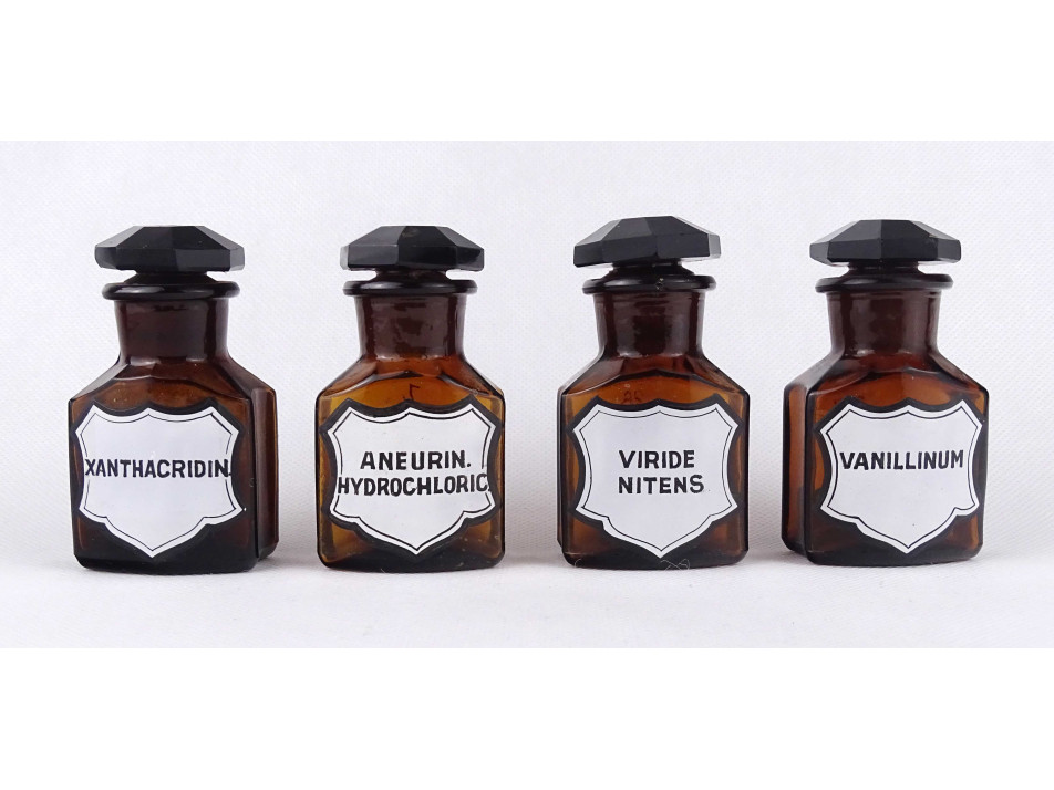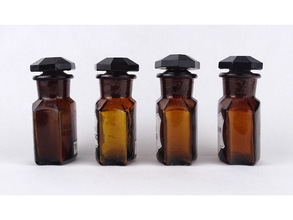 Régi, hibátlan állapotú, kisméretű, barna színű, csiszolt dugós gyógyszertári üveg, patikaüveg csomag. 4 darab különböző feliratú patika tégely.