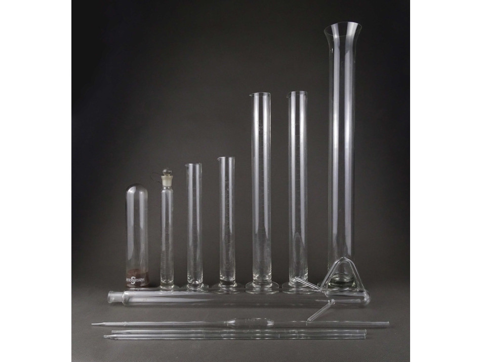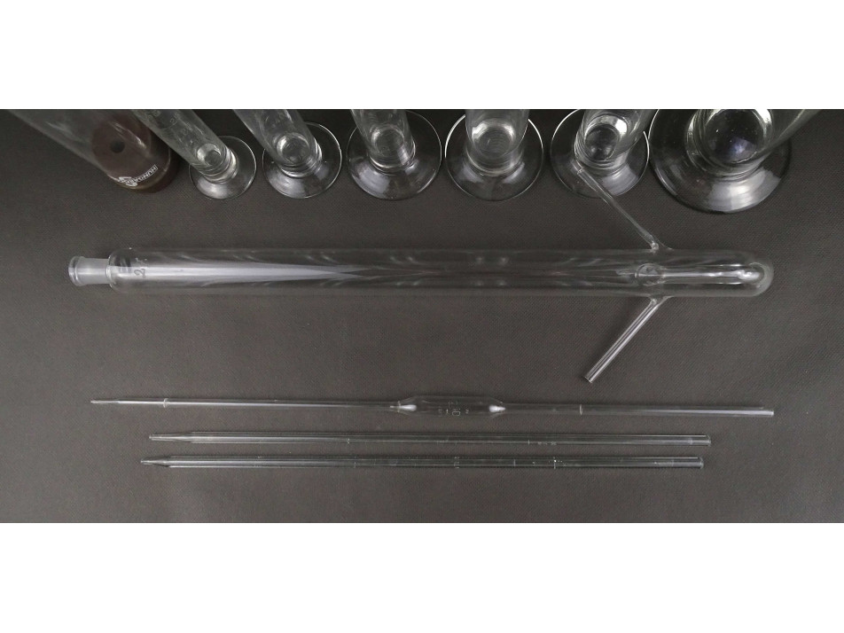 Régi laboratóriumi üveg eszköz csomag. Lombik üvegek, mérőpoharak, talpas mérő edények, pipetták, lezárt üvegcsék, sok kiegészítő gyógyszertári laboratóriumból. 11 darab egyben.