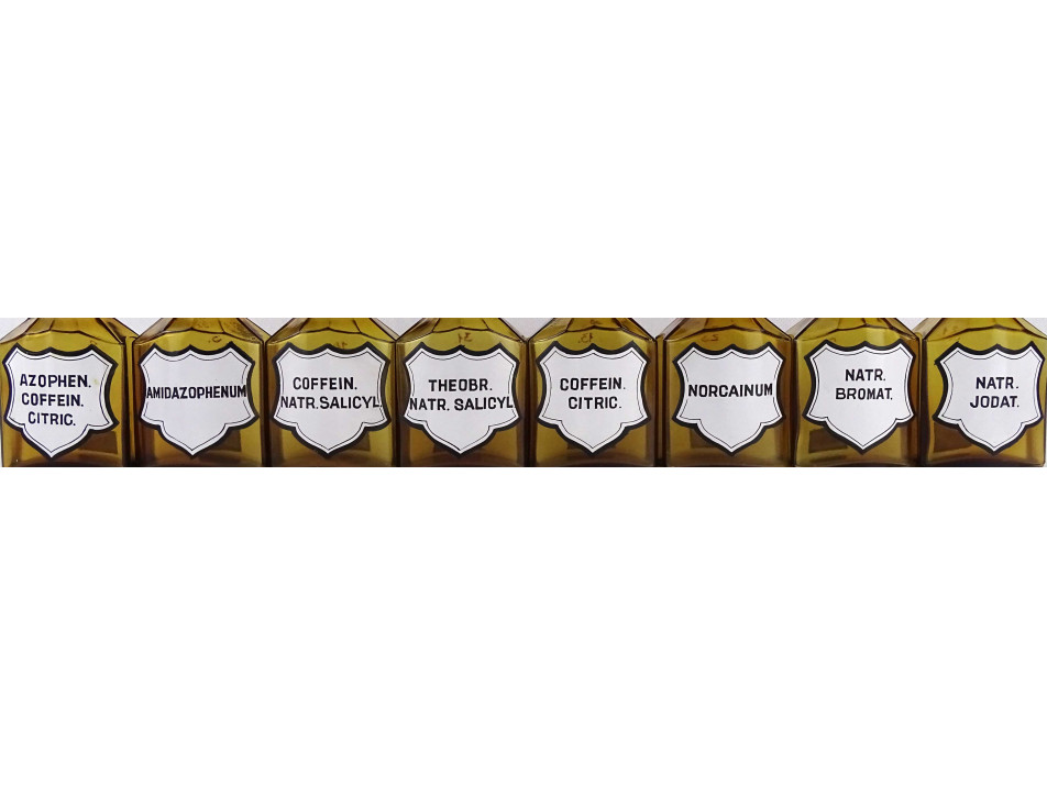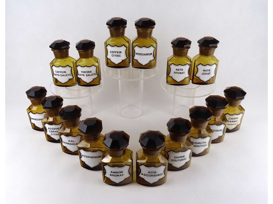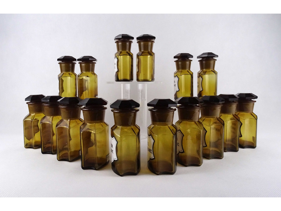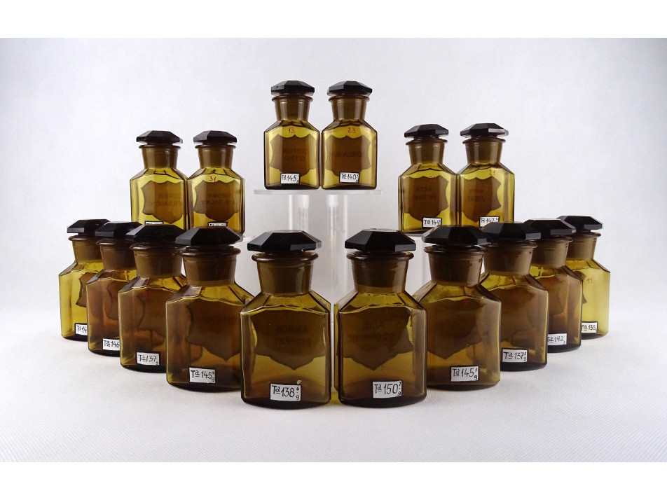 Régi, hibátlan állapotú, nagyméretű, barna színű, csiszolt dugós gyógyszertári üveg, patikaüveg csomag. 16 darab különböző feliratú patika tégely.