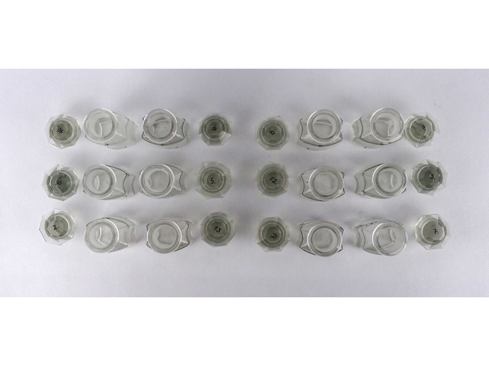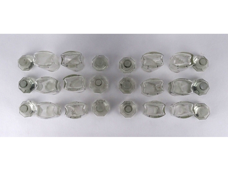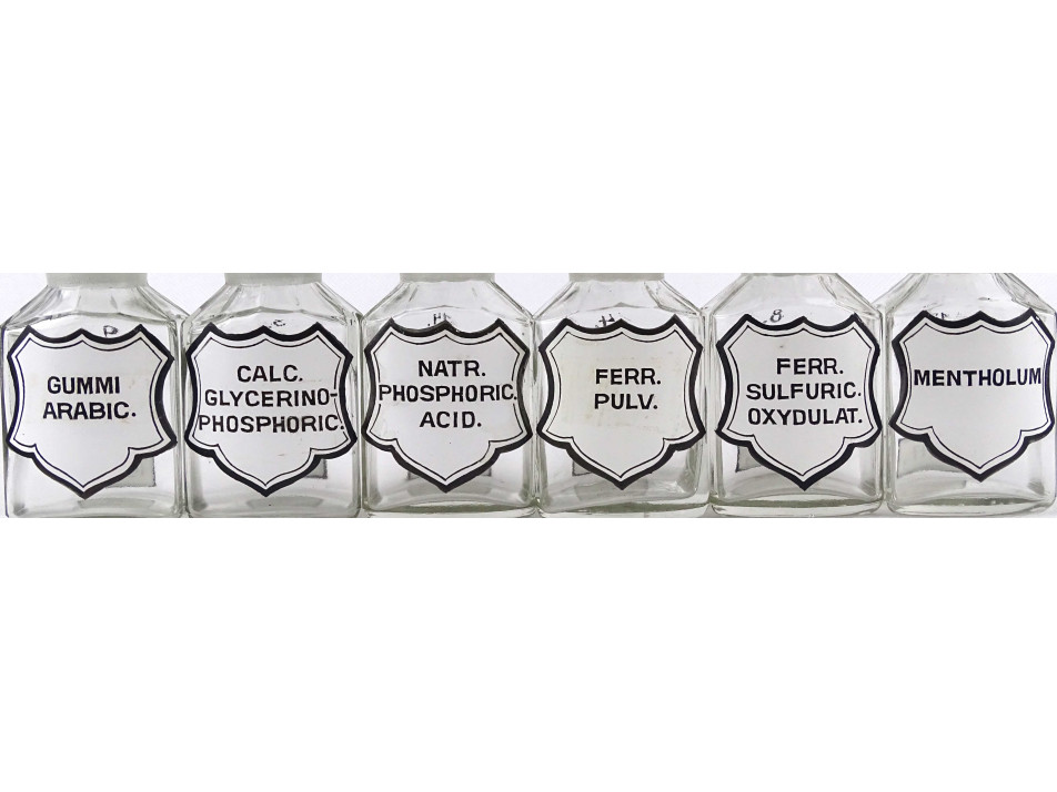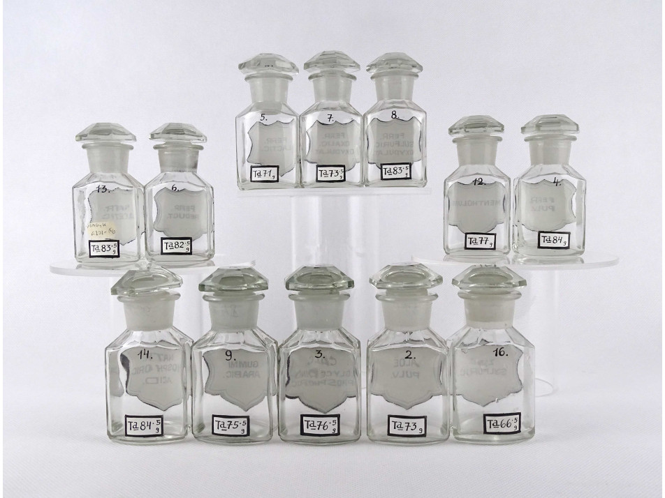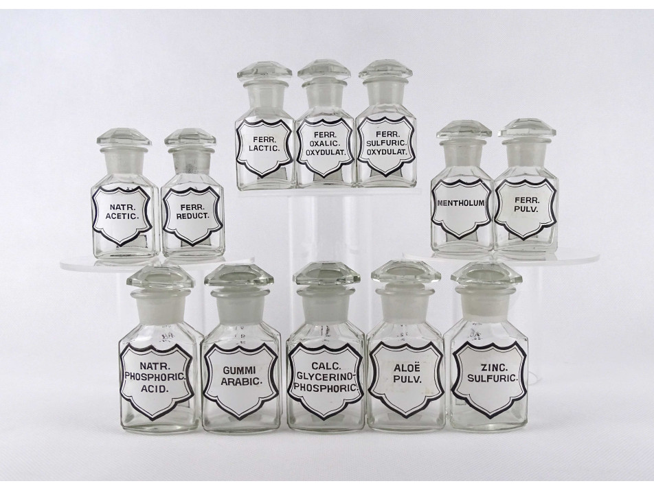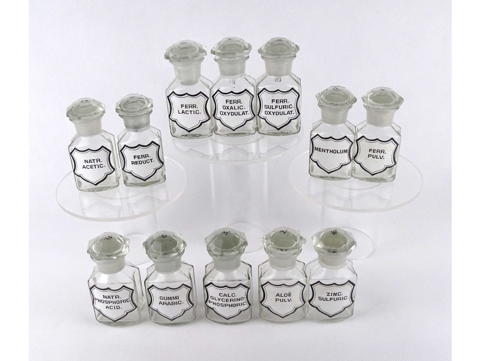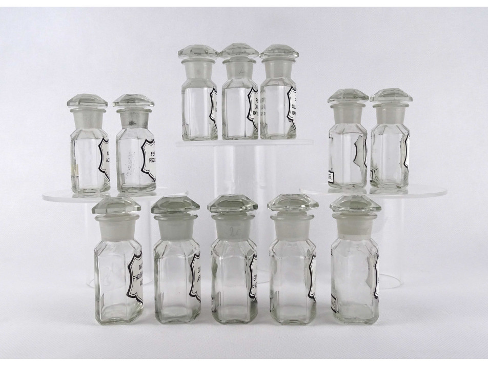 Régi, hibátlan állapotú, kisméretű, színtelen, csiszolt dugós gyógyszertári üveg, patikaüveg csomag. 12 darab különböző feliratú patika tégely.