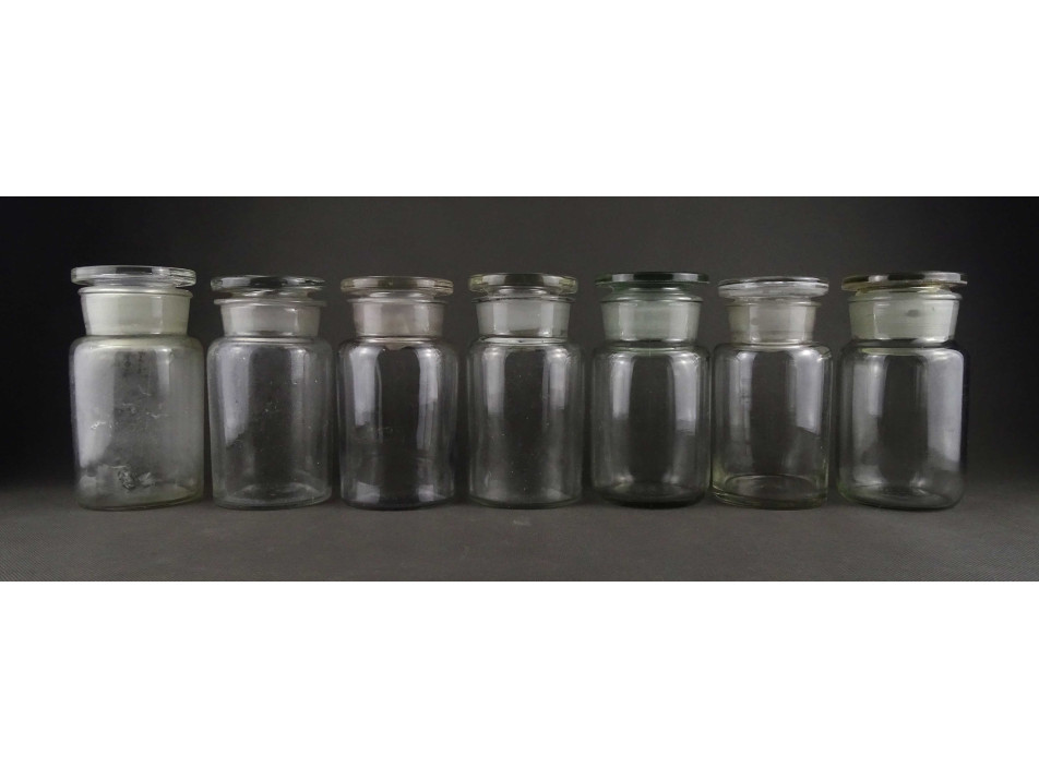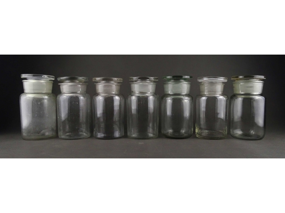 Régi, hibátlan állapotú, nagyméretű, színtelen, csiszolt dugós gyógyszertári üveg, patikaüveg csomag. 7 darab patika tégely egyben.