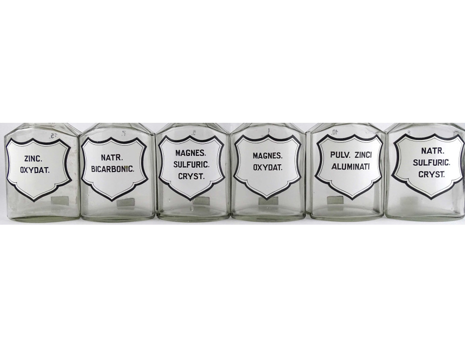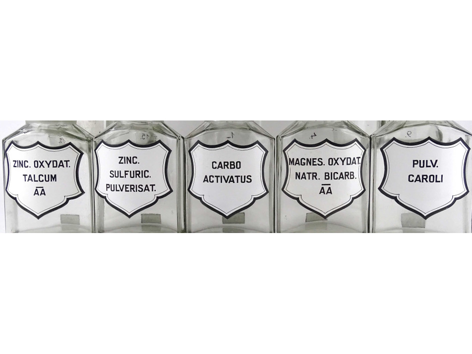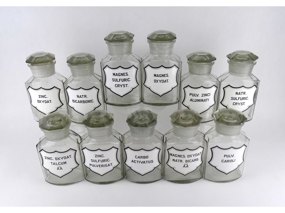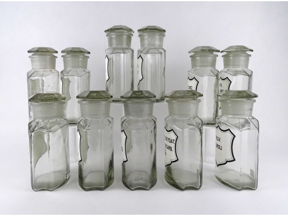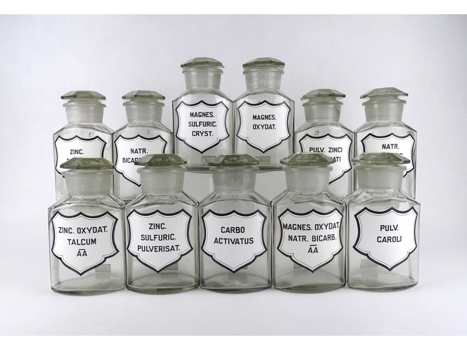 Régi, nagyméretű, színtelen, csiszolt dugós gyógyszertári üveg, patikaüveg csomag. 11 darab különböző feliratú patika tégely.