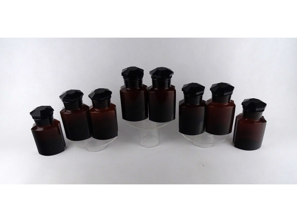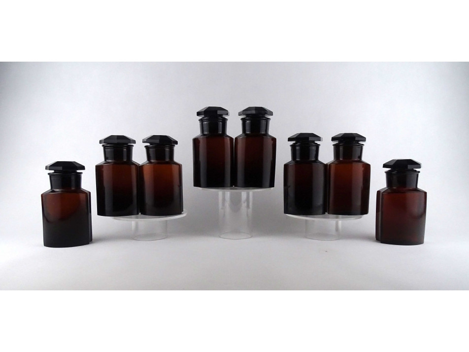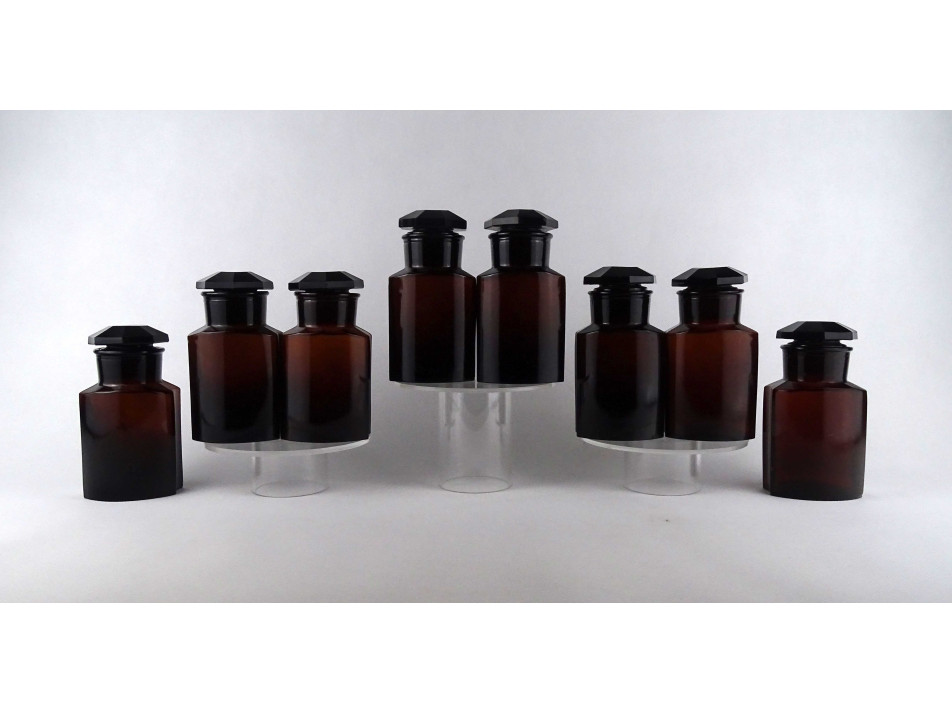 Régi, hibátlan állapotú, nagyméretű, barna színű, csiszolt dugós gyógyszertári üveg, patikaüveg csomag. 8 darab felirat nélküli patika tégely egyben.