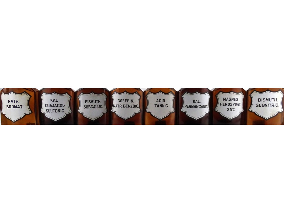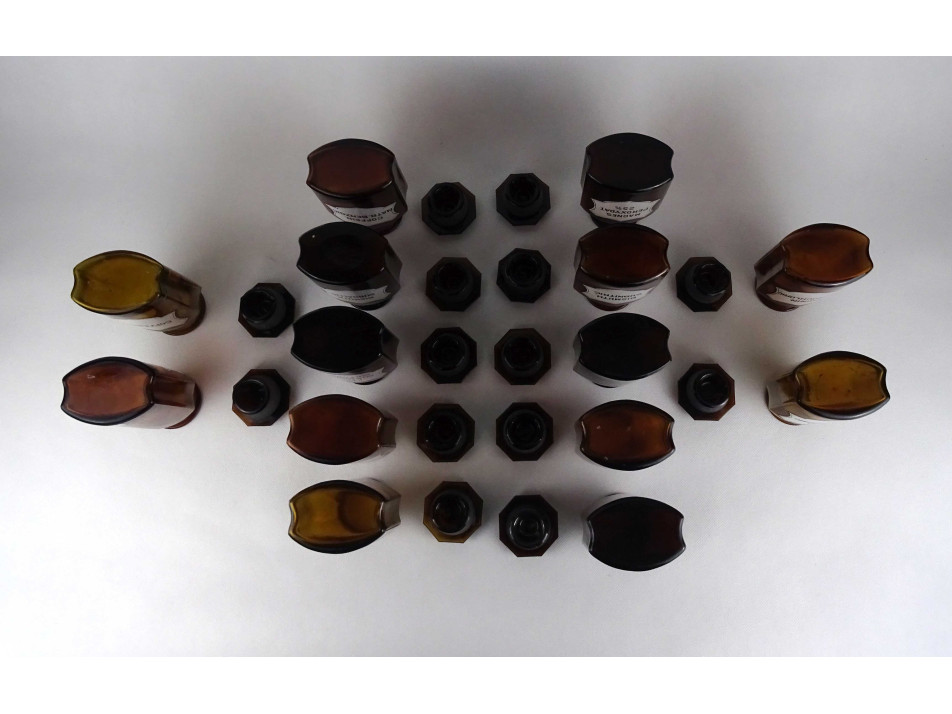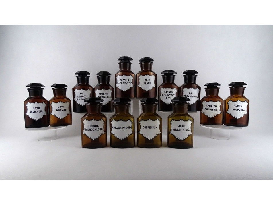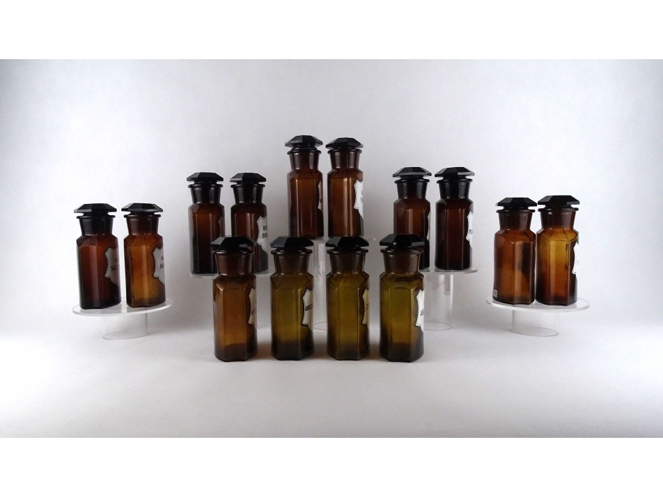 Régi, nagyméretű, barna színű, csiszolt dugós gyógyszertári üveg, patikaüveg csomag. 14 darab különböző feliratú patika tégely.