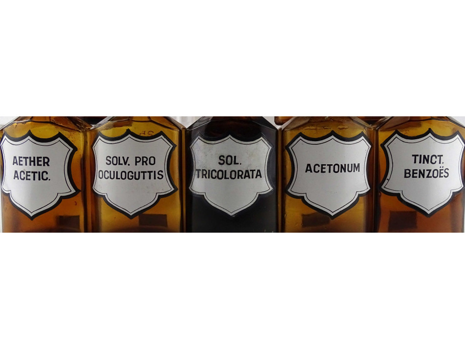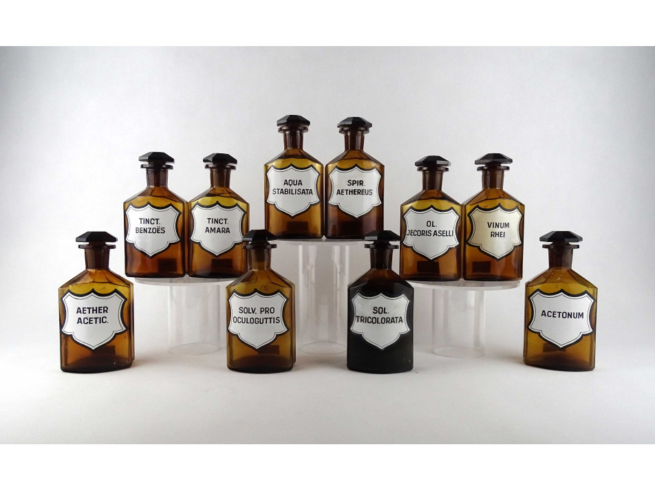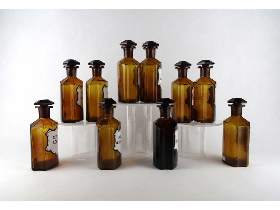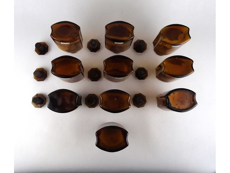 Régi, nagyméretű, barna színű, keskeny nyakú, csiszolt dugós gyógyszertári üveg, patikaüveg csomag. 10 darab különböző feliratú patika tégely.