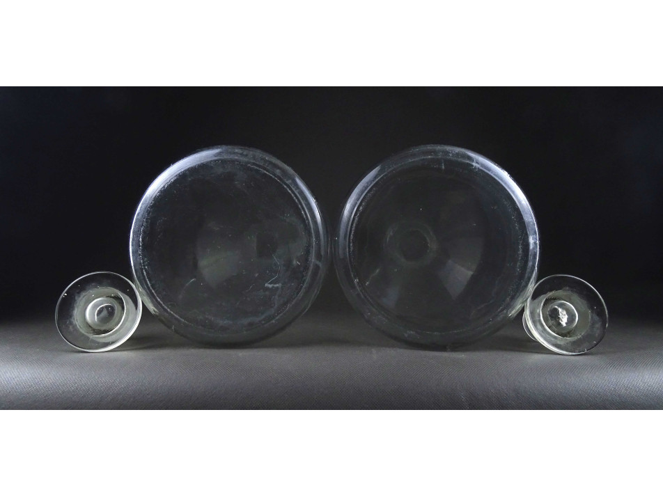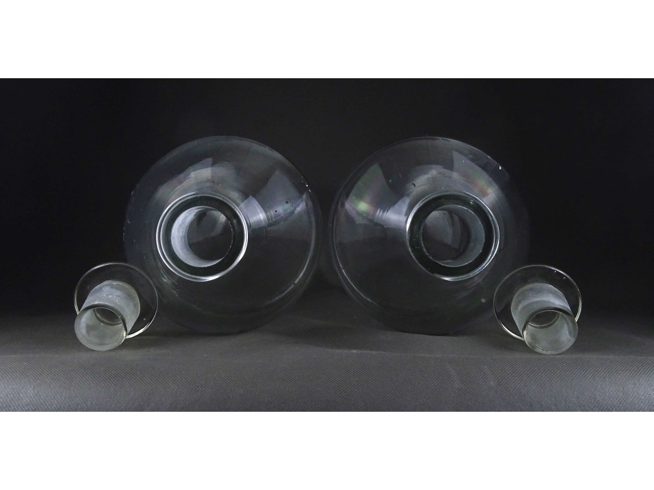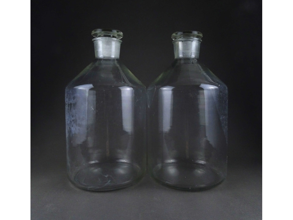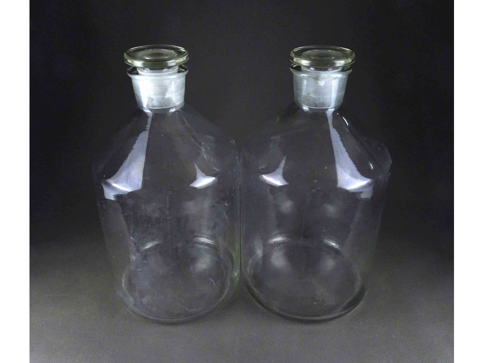 2 darab, régi, hibátlan állapotú, nagyméretű, csiszolt dugós színtelen patika üveg, gyógyszerészeti tároló üveg ballon. Körülbelül 5 literesek lehetnek.