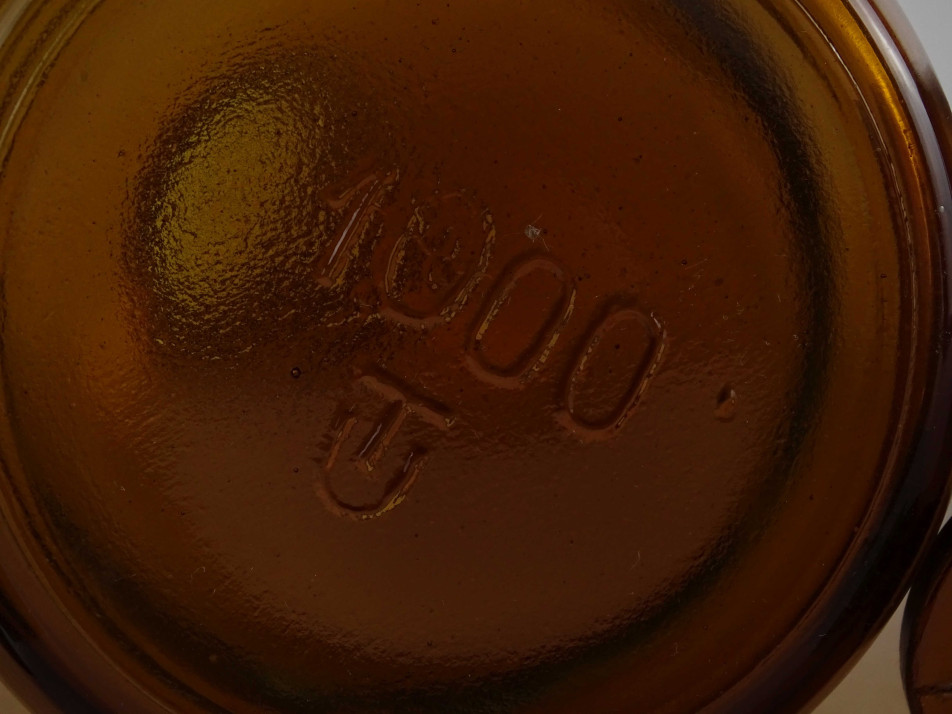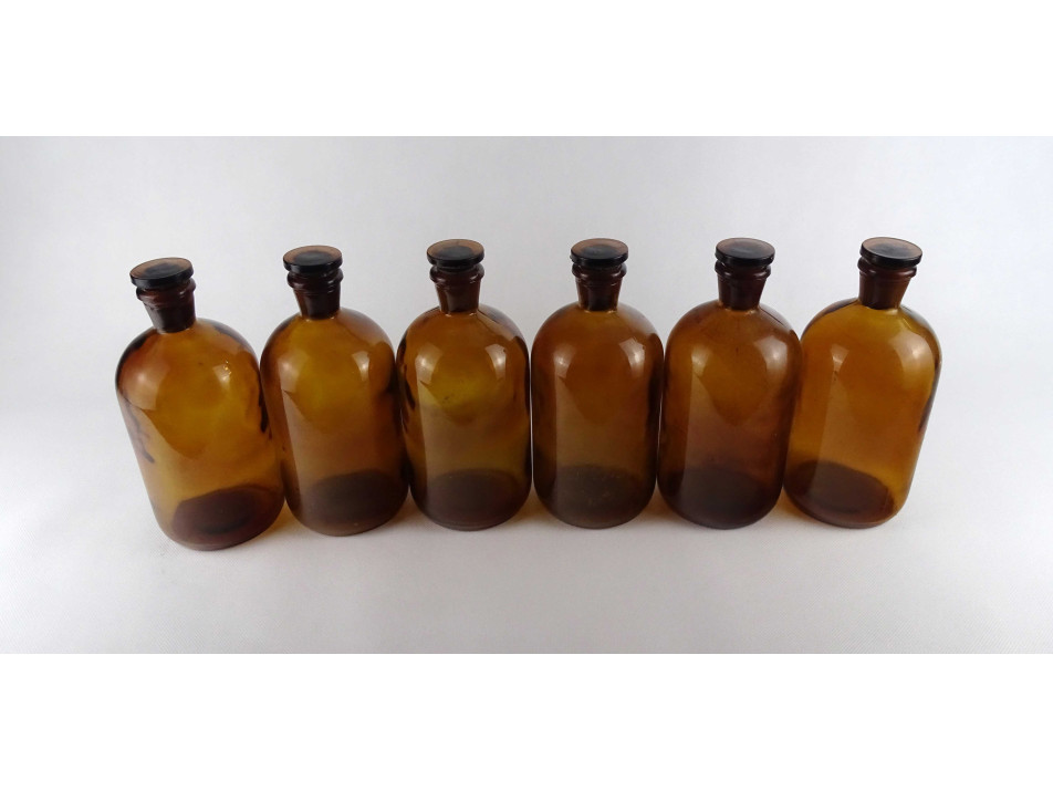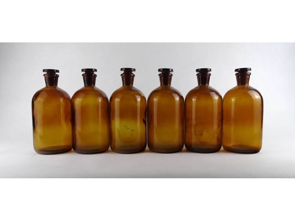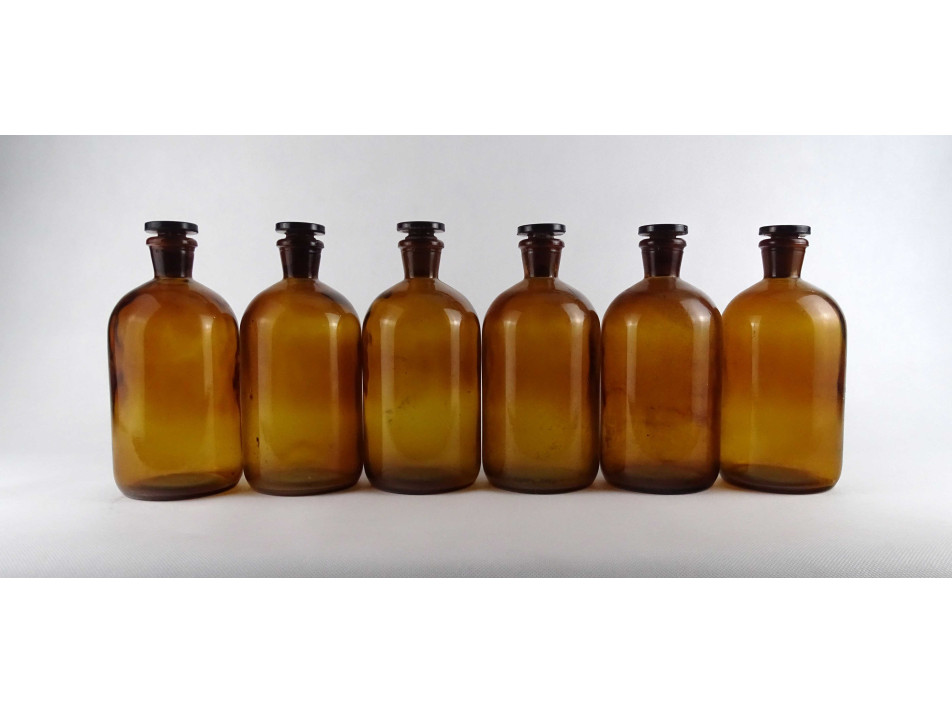 Régi, hibátlan állapotú, nagyméretű, 1 literes, barna színű, csiszolt dugós gyógyszertári üveg, patika üveg palack csomag. 6 darab egyben.