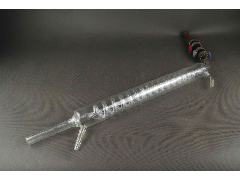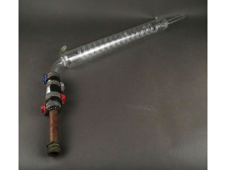 Régi nagyméretű üveg spirál hűtő laboratóriumi eszköz réz csőcsatlakozással